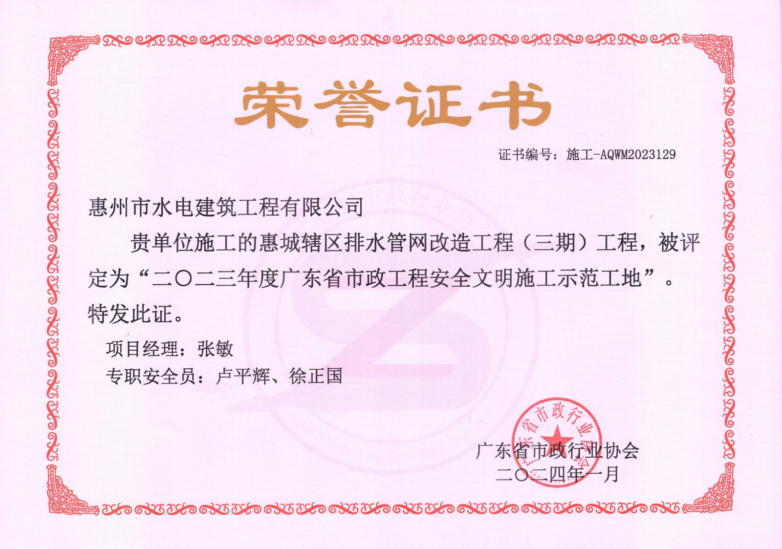 近日,我司收到廣東省市政行業(yè)協(xié)會發(fā)來的榮譽證書,承建的惠城轄區(qū)排水管網改造工程(三期)工程榮獲“2023年度廣東省市政工程安全文明施工示范工地”。這是繼惠州市白花河防洪排澇治理工程項目之后,公司在2023年度獲得的又一項省級安全文明工地獎項,為公司年度創(chuàng)優(yōu)工作劃上…......
