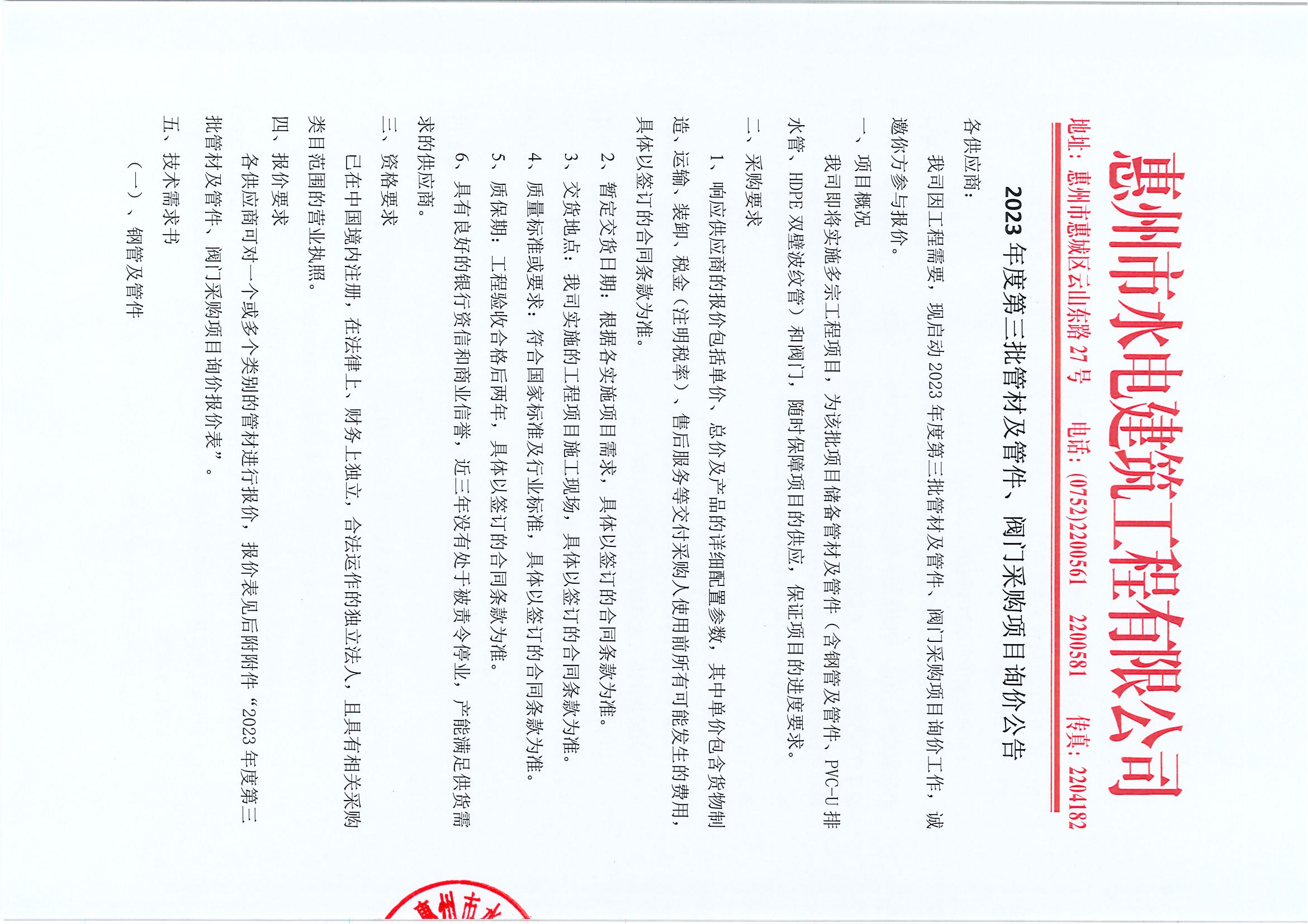 2023年度第三批管材及管件、閥門采購項(xiàng)目詢價(jià)公告