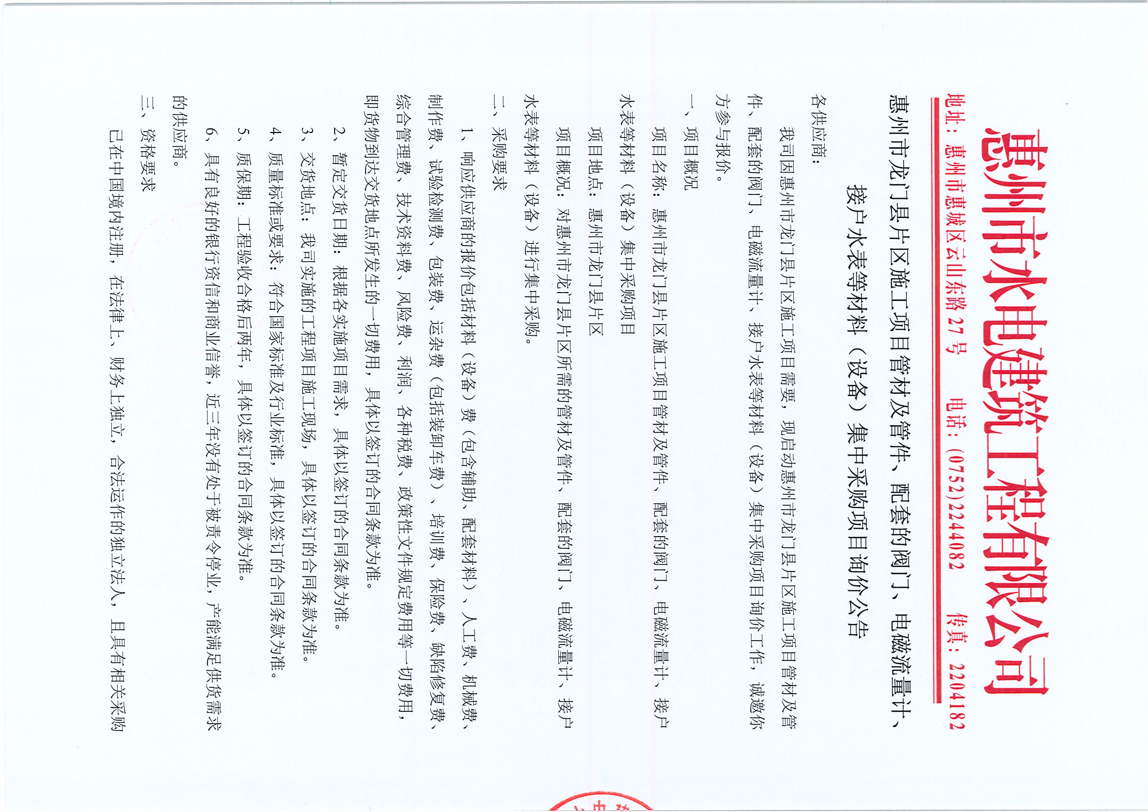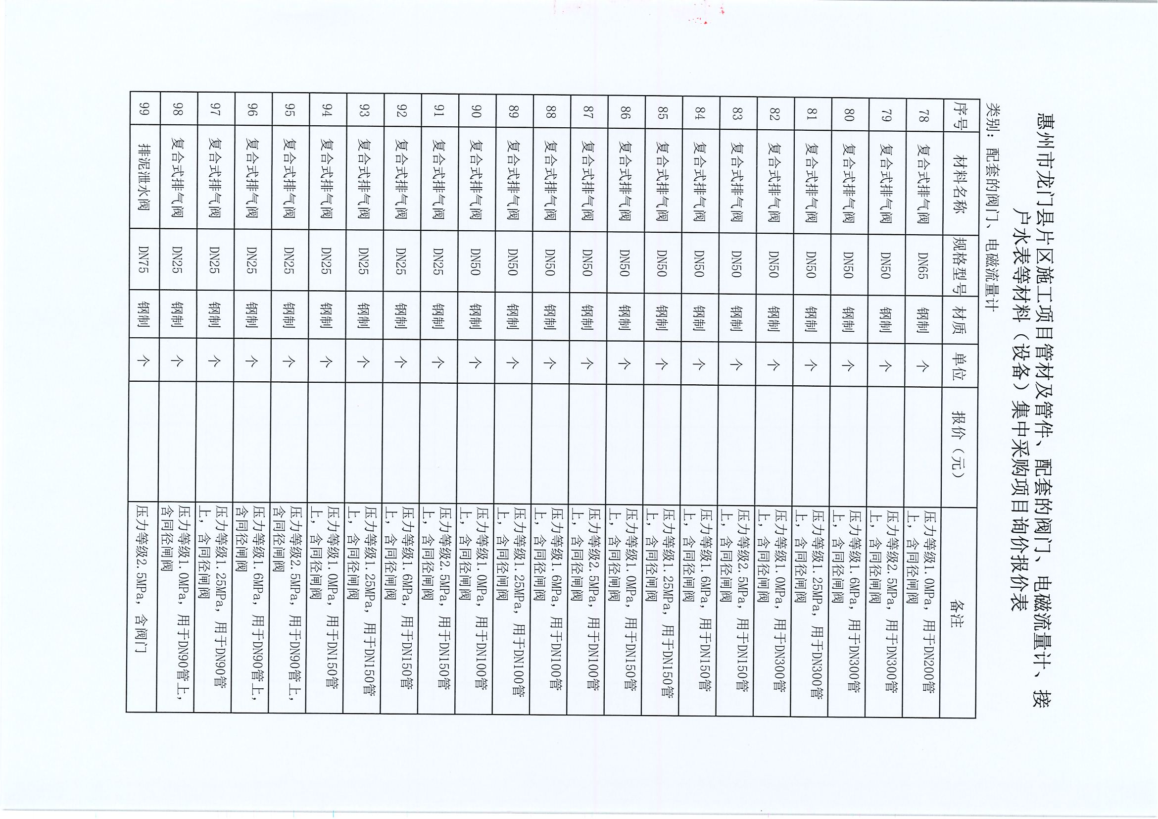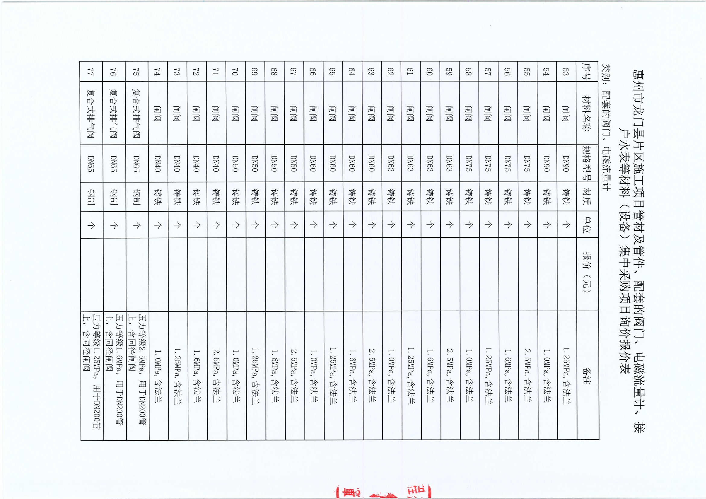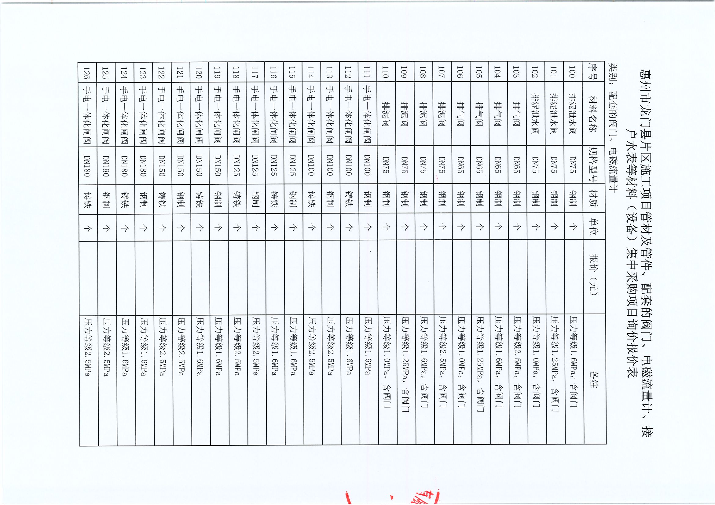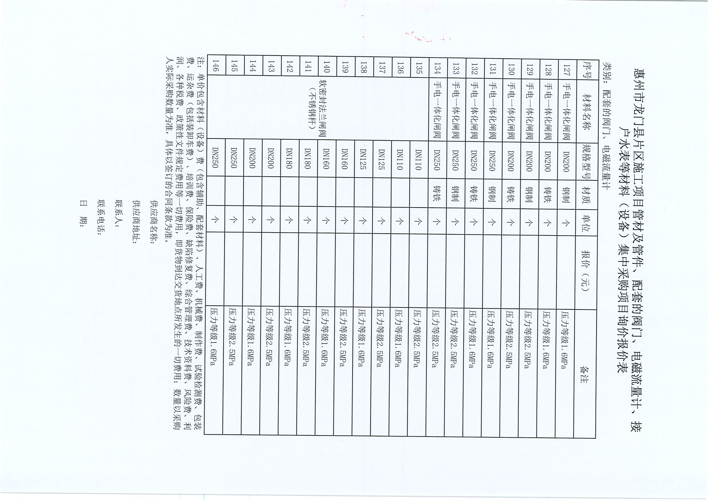 惠州市龍門縣片區(qū)施工項目管材及管件、配套的閥門、電磁流量計、接戶水表等材料(設備)集中采購項目詢價公告