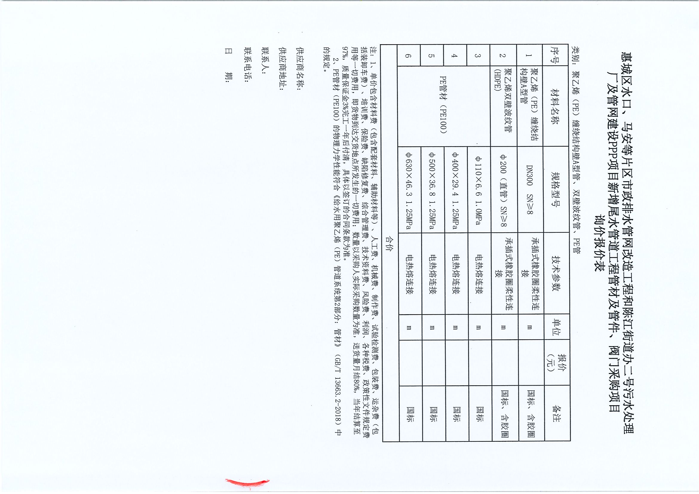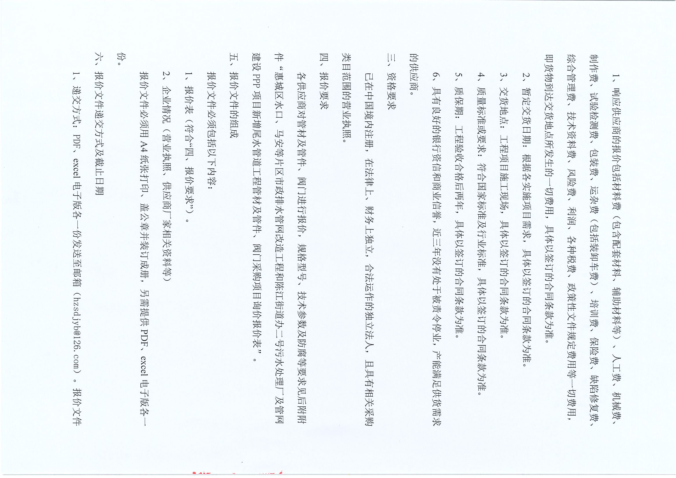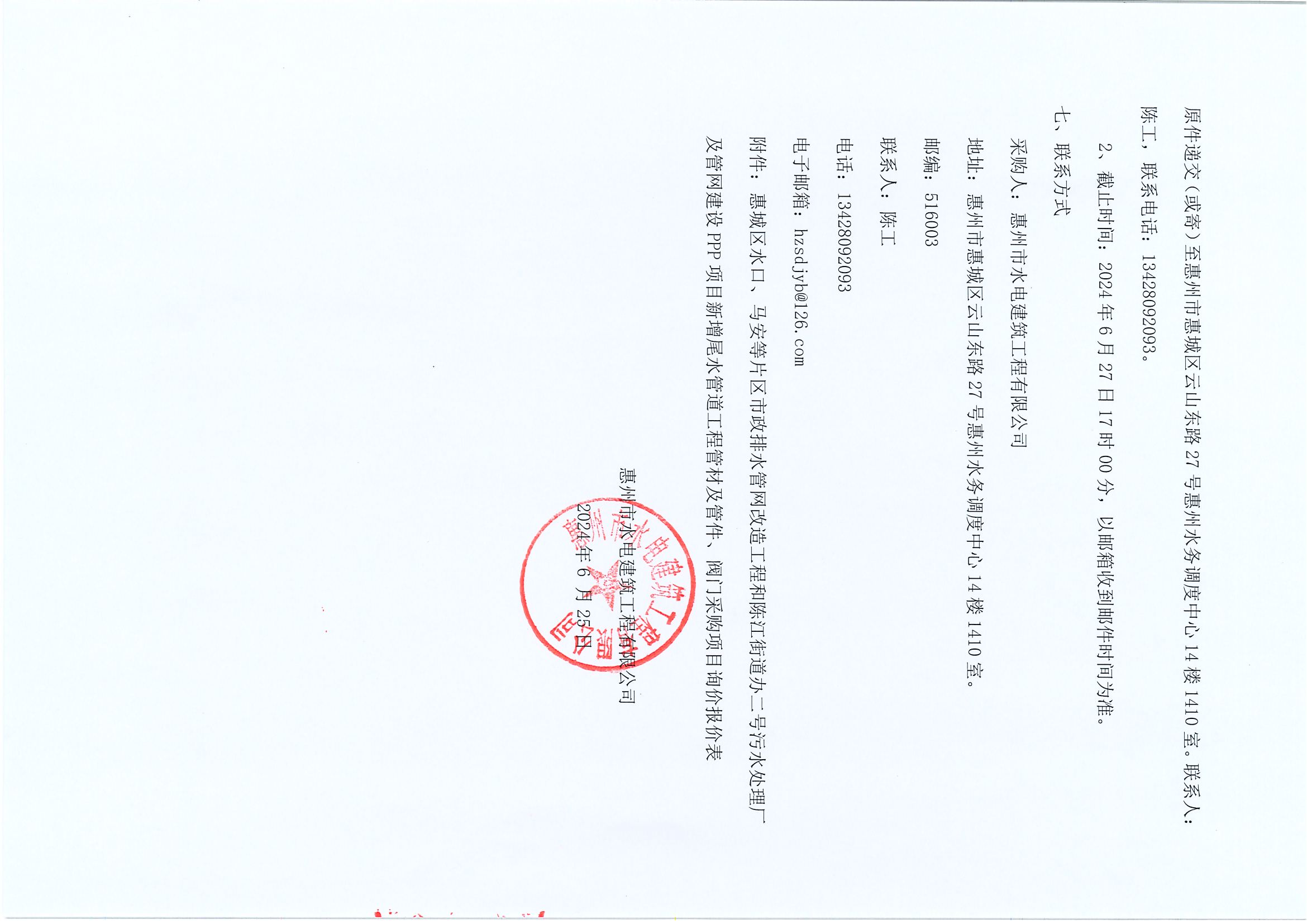 惠城區(qū)水口、馬安等片區(qū)市政排水管網(wǎng)改造工程和陳江街道辦二號污水處理廠及管網(wǎng)建設(shè)PPP項目新增尾水管道工程管材及管件、閥門采購項目詢價公告