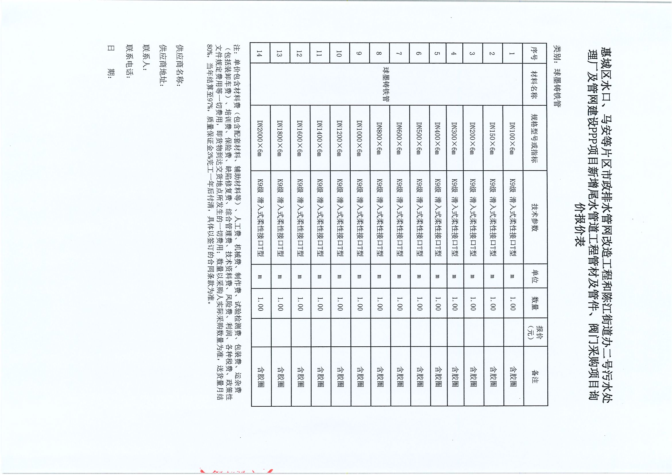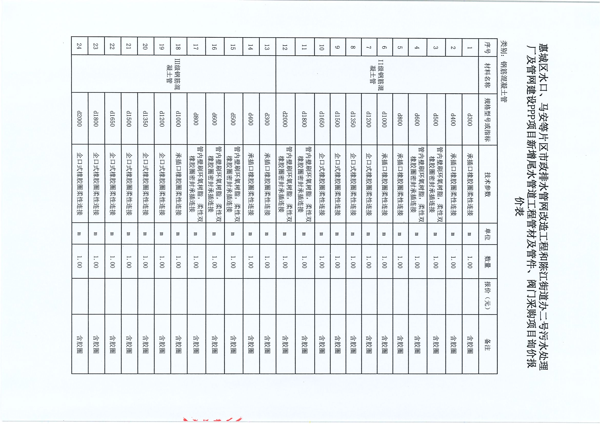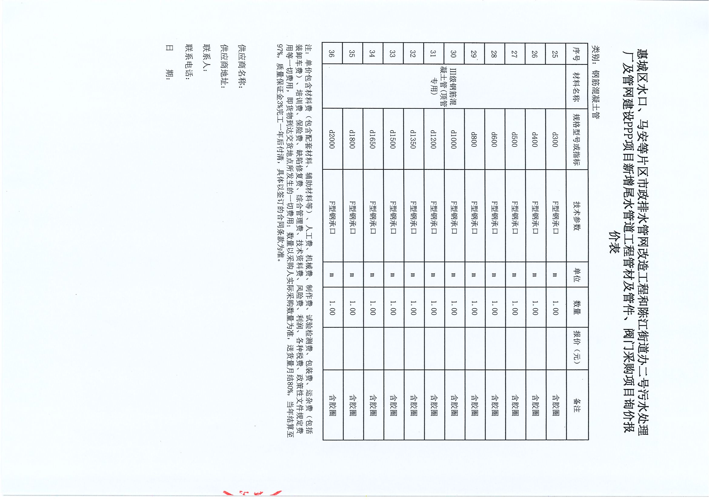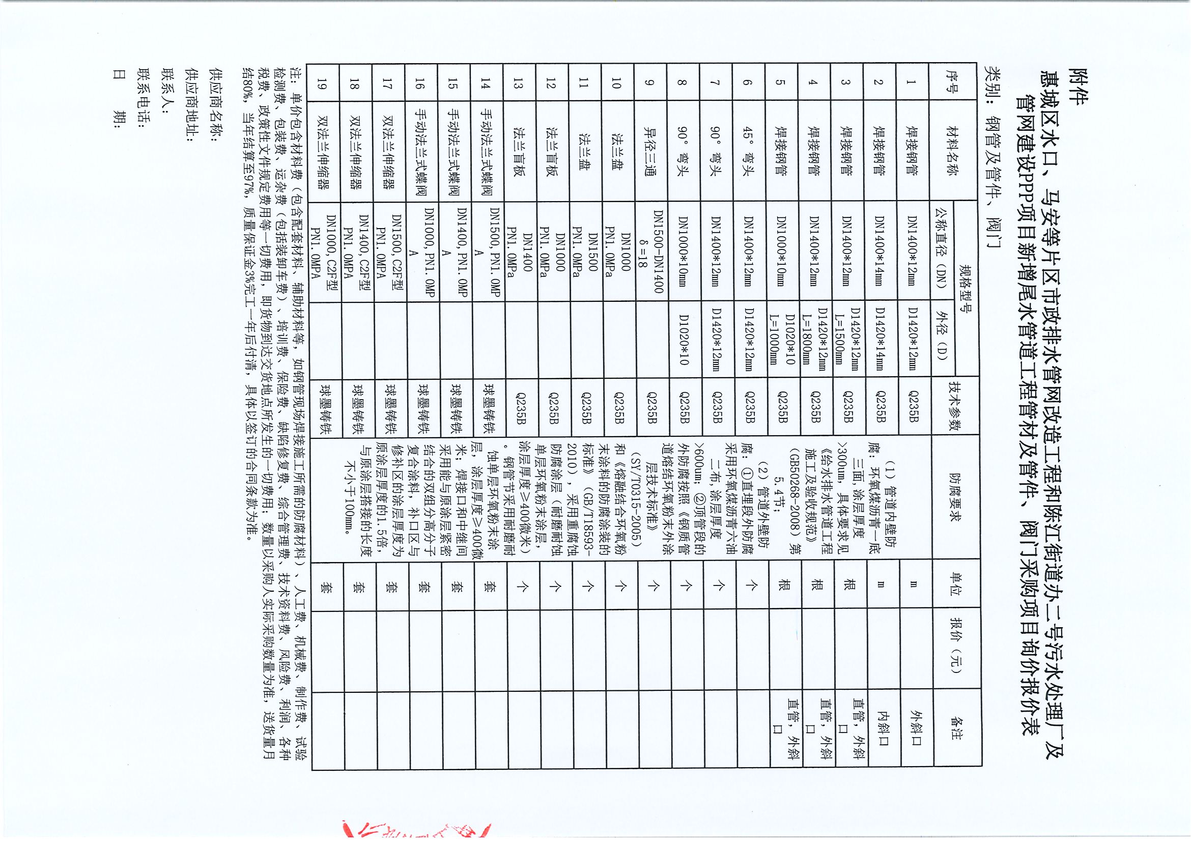惠城區(qū)水口、馬安等片區(qū)市政排水管網(wǎng)改造工程和陳江街道辦二號污水處理廠及管網(wǎng)建設(shè)PPP項目新增尾水管道工程管材及管件、閥門采購項目詢價公告