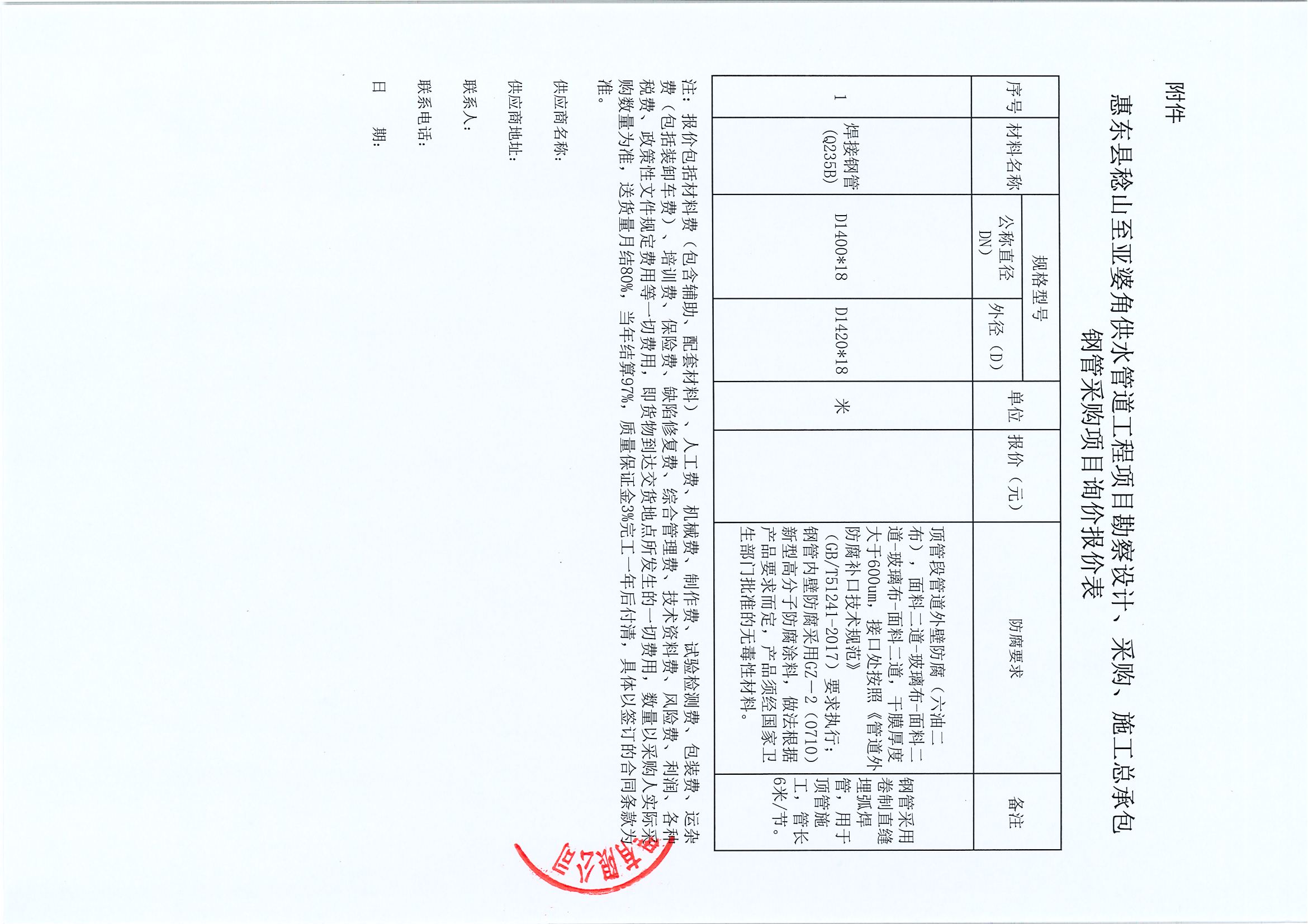 附件:惠東縣稔山至亞婆角供水管道工程項目勘察設(shè)計、采購、施工總承包鋼管采購項目詢價報價表