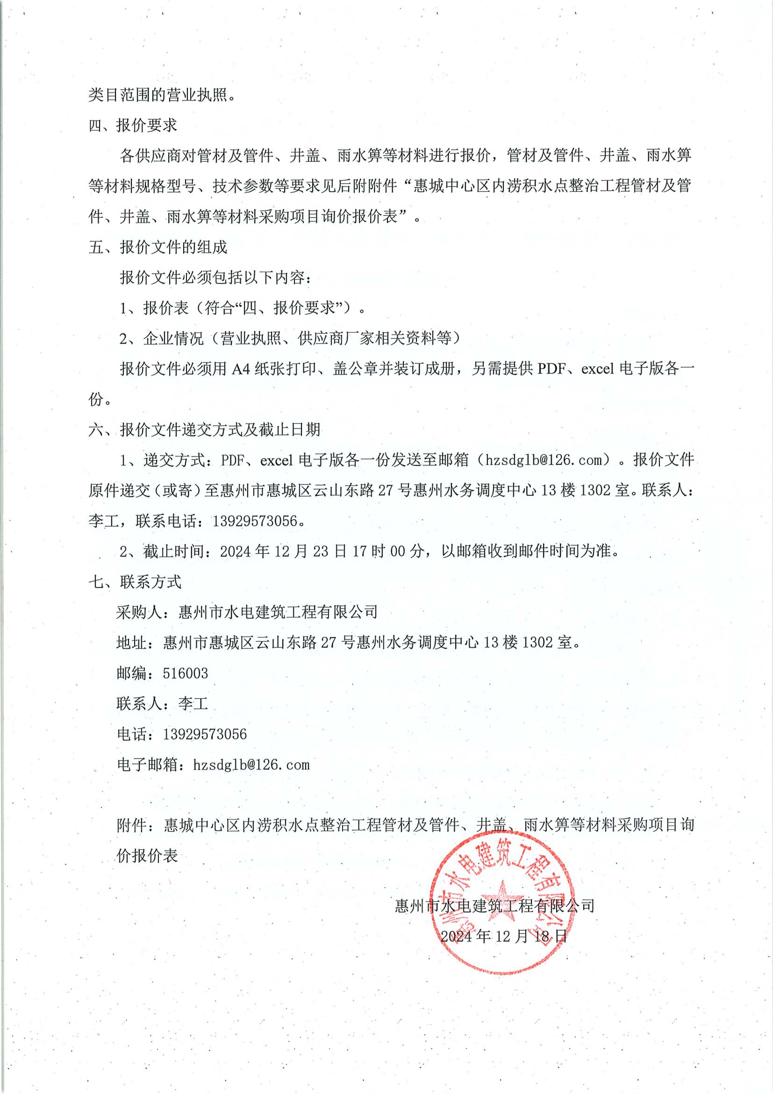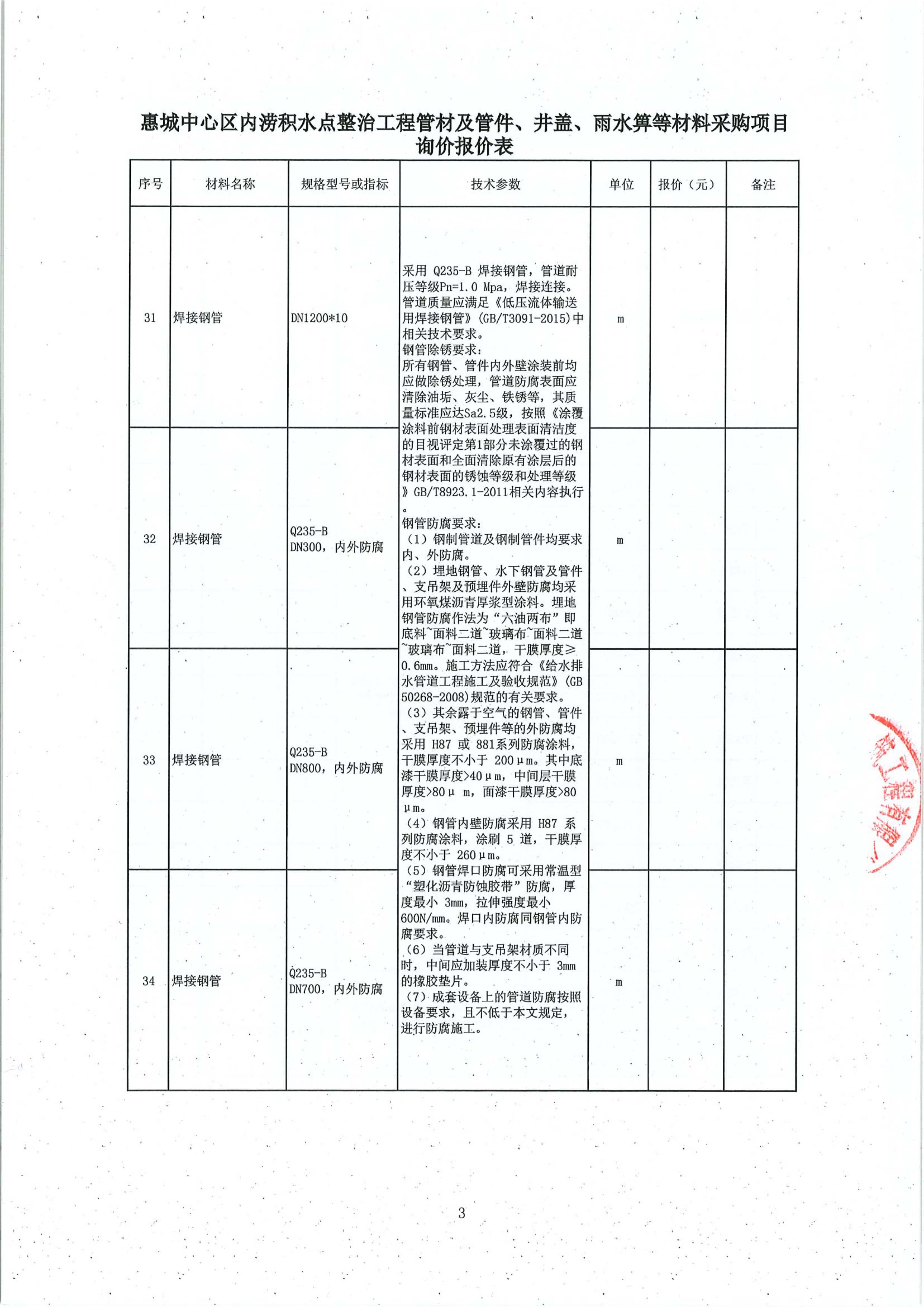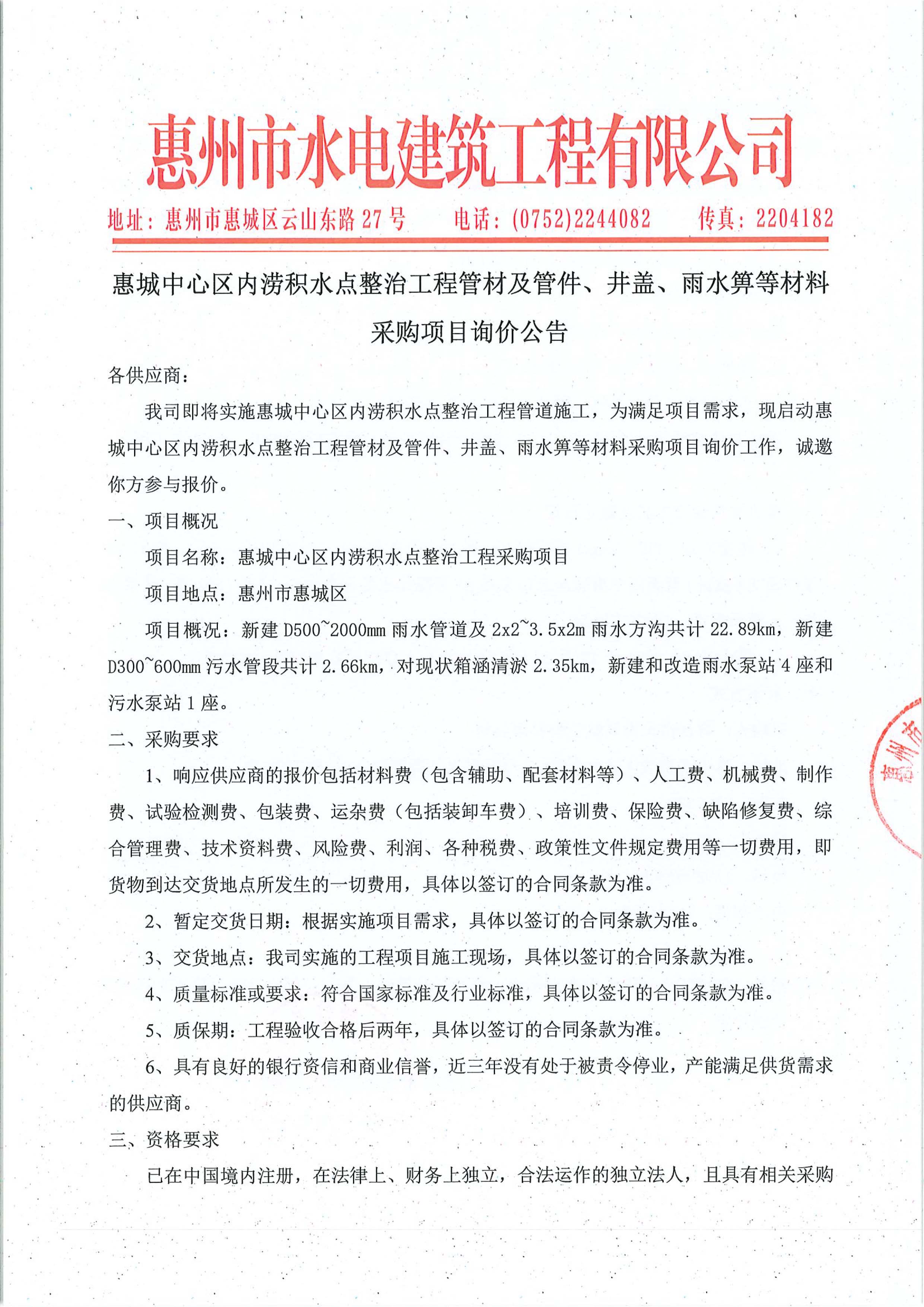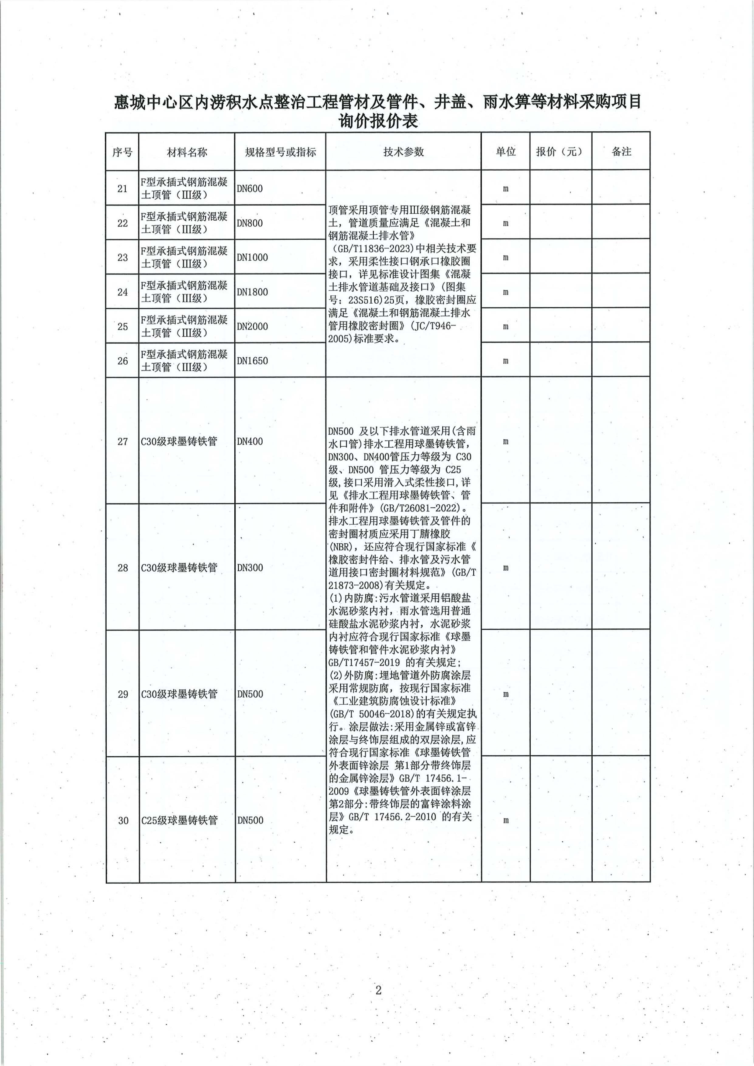 惠城中心區(qū)內(nèi)澇積水點整治工程管材及管件、井蓋、雨水箅等材料采購項目詢價公告