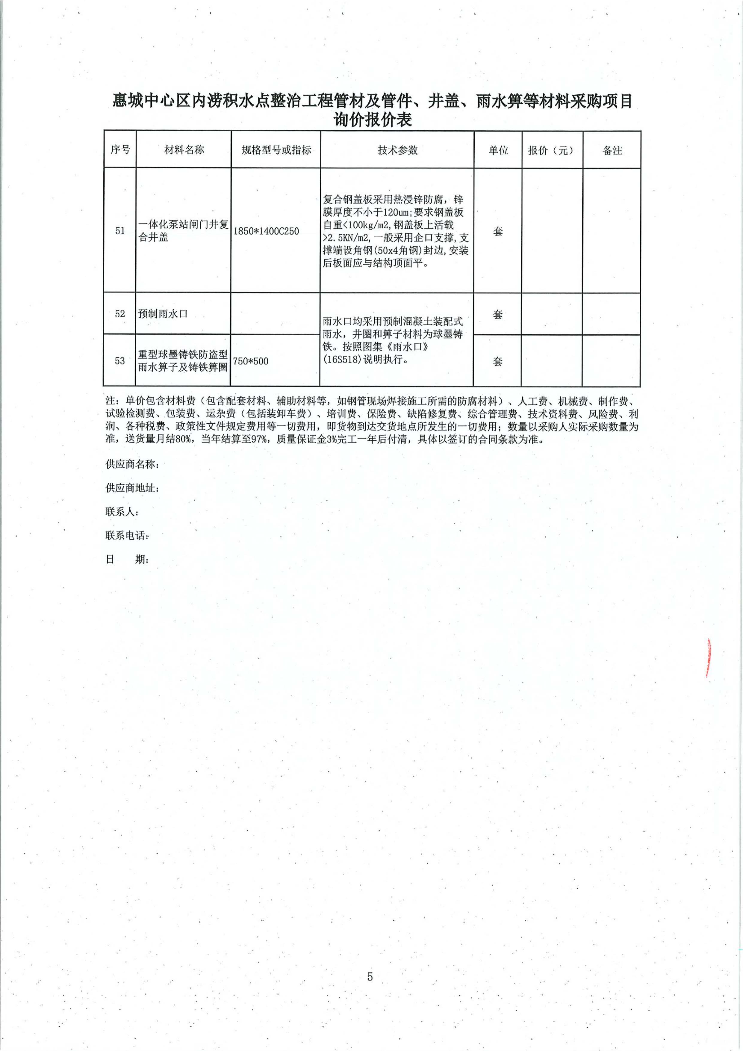 附件:惠城中心區(qū)內(nèi)澇積水點整治工程管材及管件、井蓋、雨水箅等材料采購項目詢價報價表