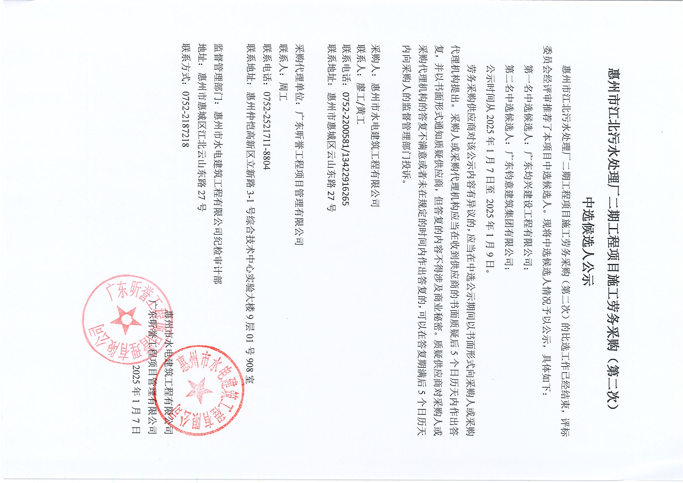 惠州市江北污水處理廠二期工程項(xiàng)目施工勞務(wù)采購(gòu)(第二次)中選候選人公示