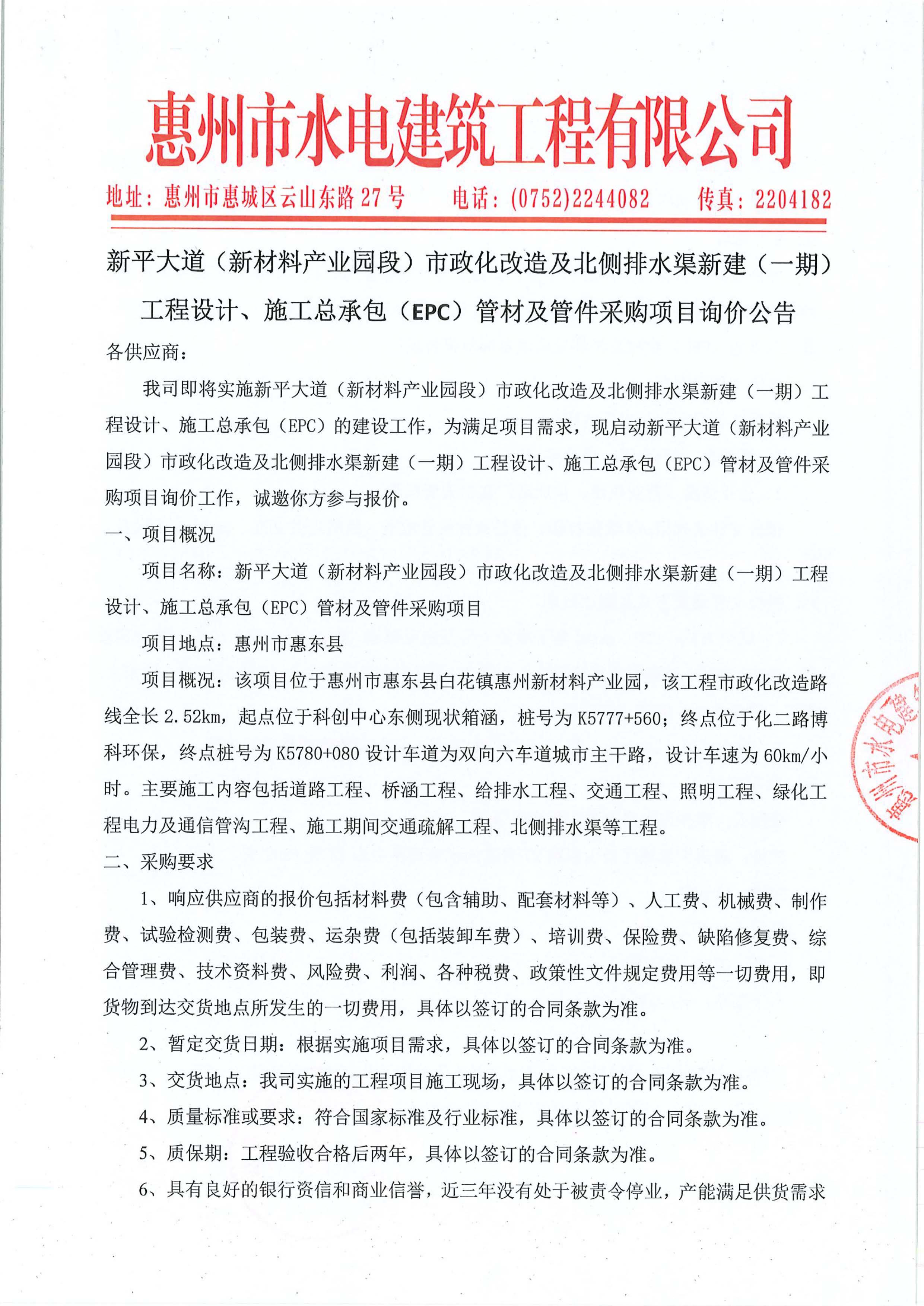新平大道(新材料產(chǎn)業(yè)園段)市政化改造及北側(cè)排水渠新建(一期)工程設(shè)計、施工總承包(EPC)管材及管件采購項目詢價公告附件: