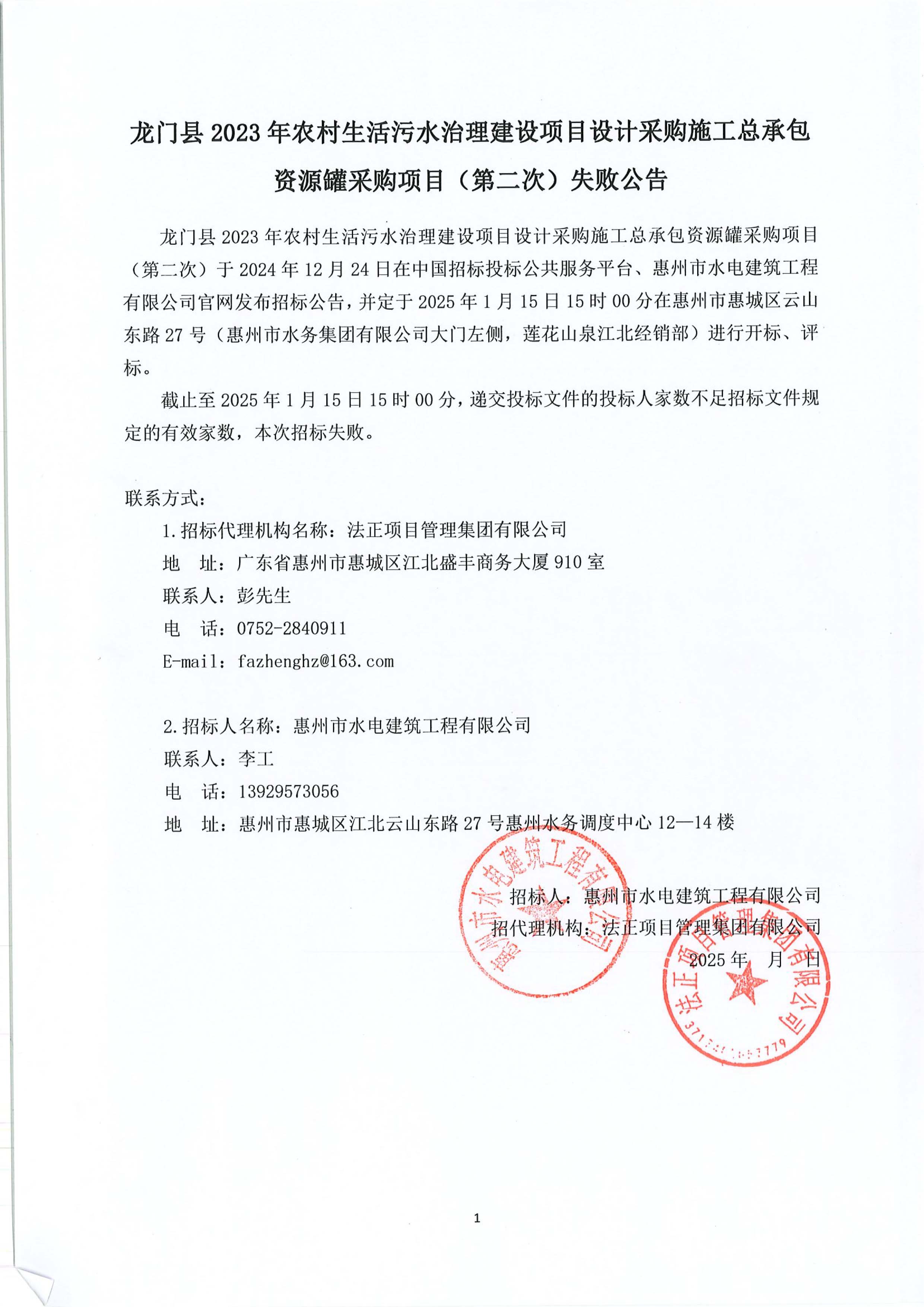 龍門縣2023年農(nóng)村生活污水治理建設(shè)項(xiàng)目設(shè)計(jì)采購施工總承包資源罐采購項(xiàng)目(第二次)失敗公告