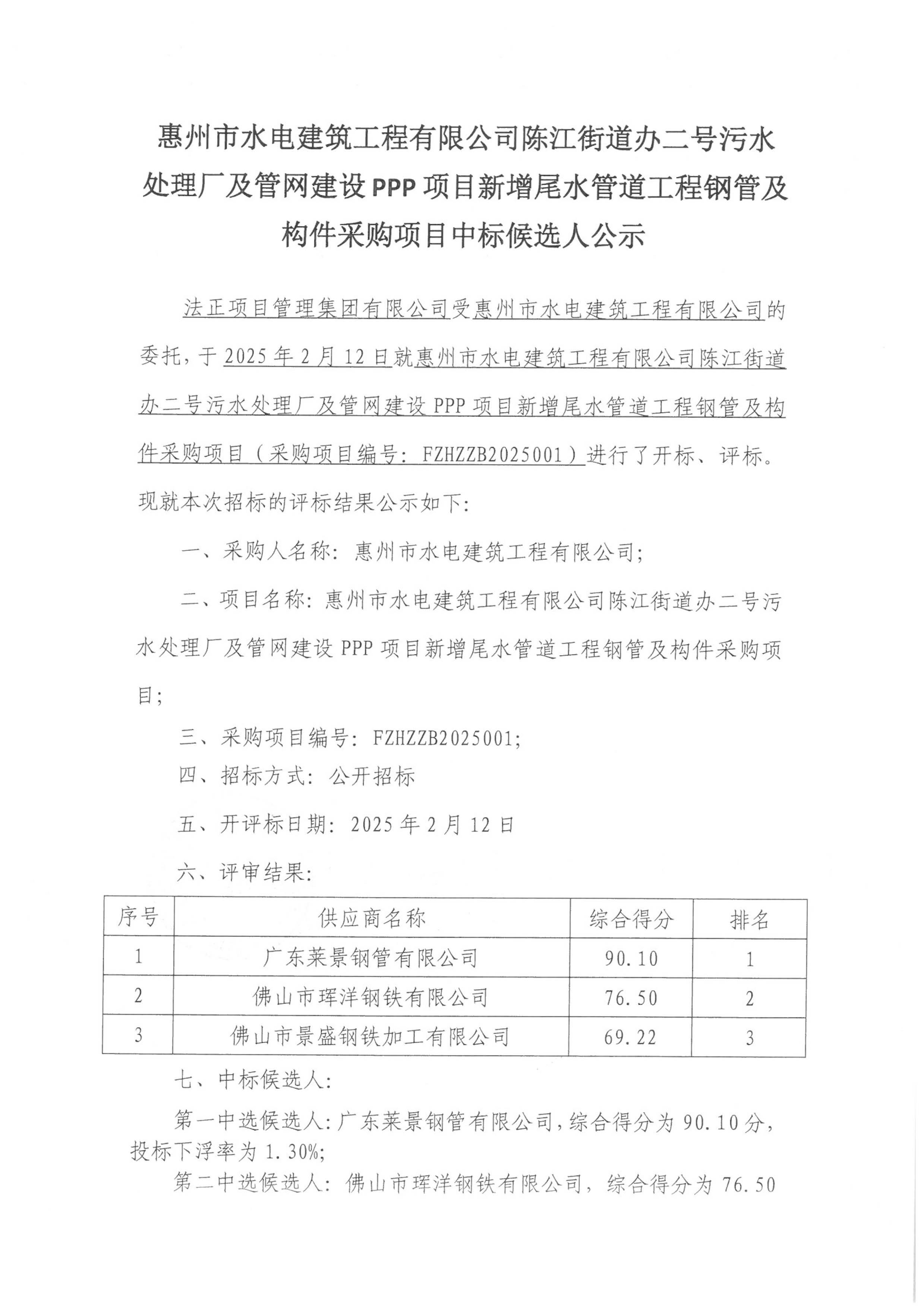 陳江街道辦二號污水處理廠及管網(wǎng)建設(shè)PPP項目新增尾水管道工程鋼管及構(gòu)件采購項目中標(biāo)候選人公示