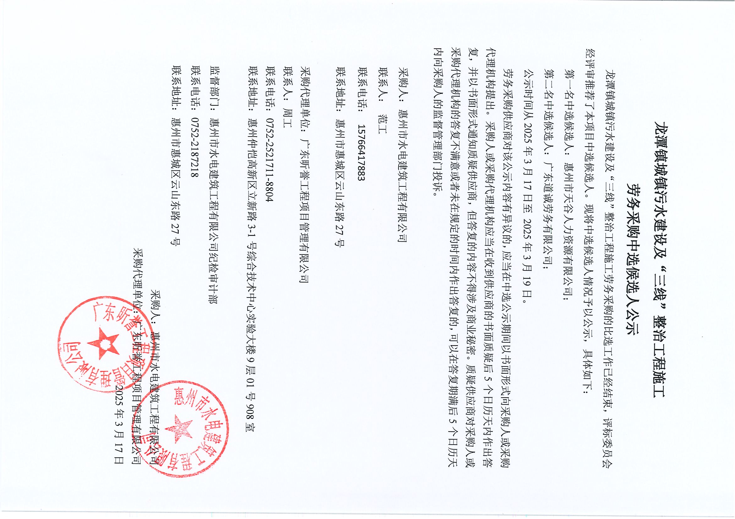 龍?zhí)舵?zhèn)城鎮(zhèn)污水建設(shè)及“三線”整治工程施工勞務(wù)采購中選候選人公示