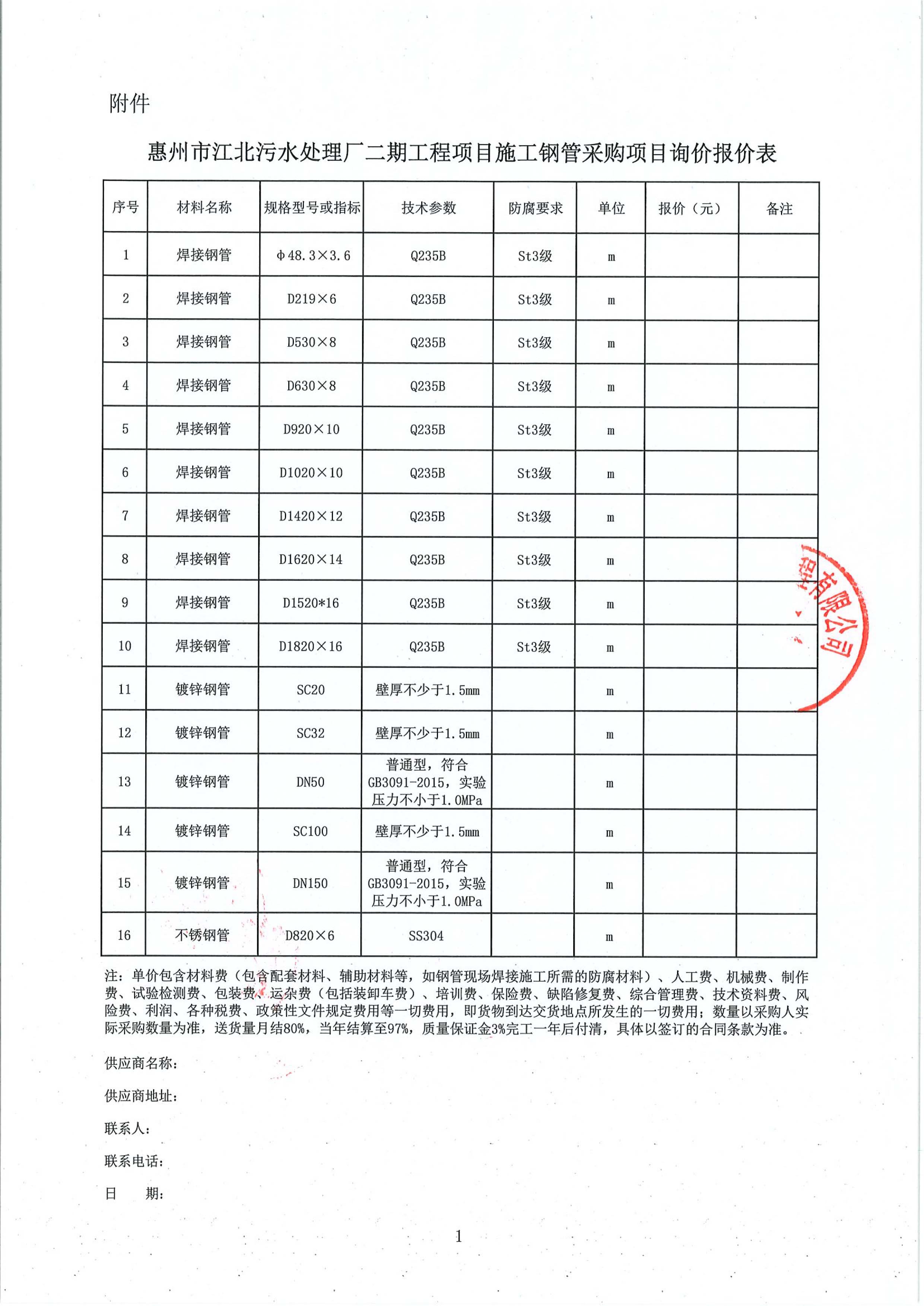 惠州市江北污水處理廠二期工程項(xiàng)目施工鋼管采購(gòu)項(xiàng)目詢(xún)價(jià)公告附件: