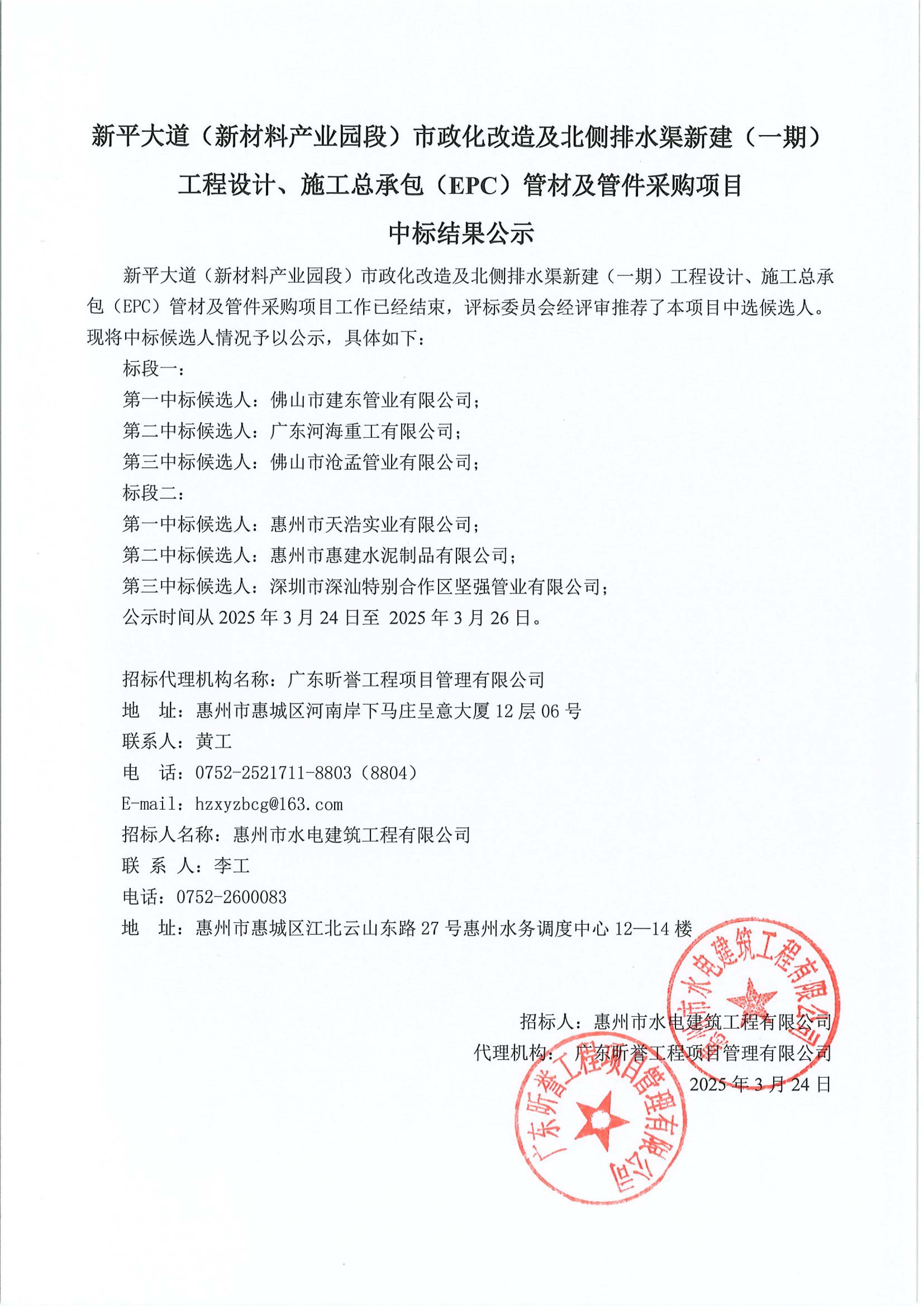 新平大道(新材料產(chǎn)業(yè)園段)市政化改造及北側(cè)排水渠新建(一期)工程設(shè)計(jì)、施工總承包(EPC)管材及管件采購項(xiàng)目中標(biāo)結(jié)果公示