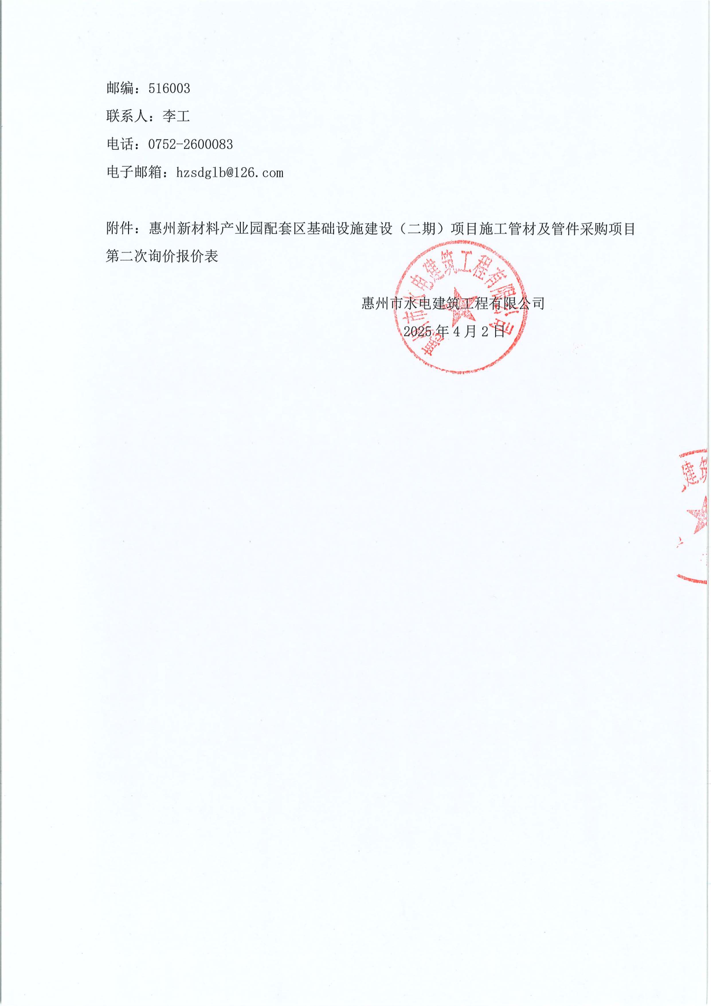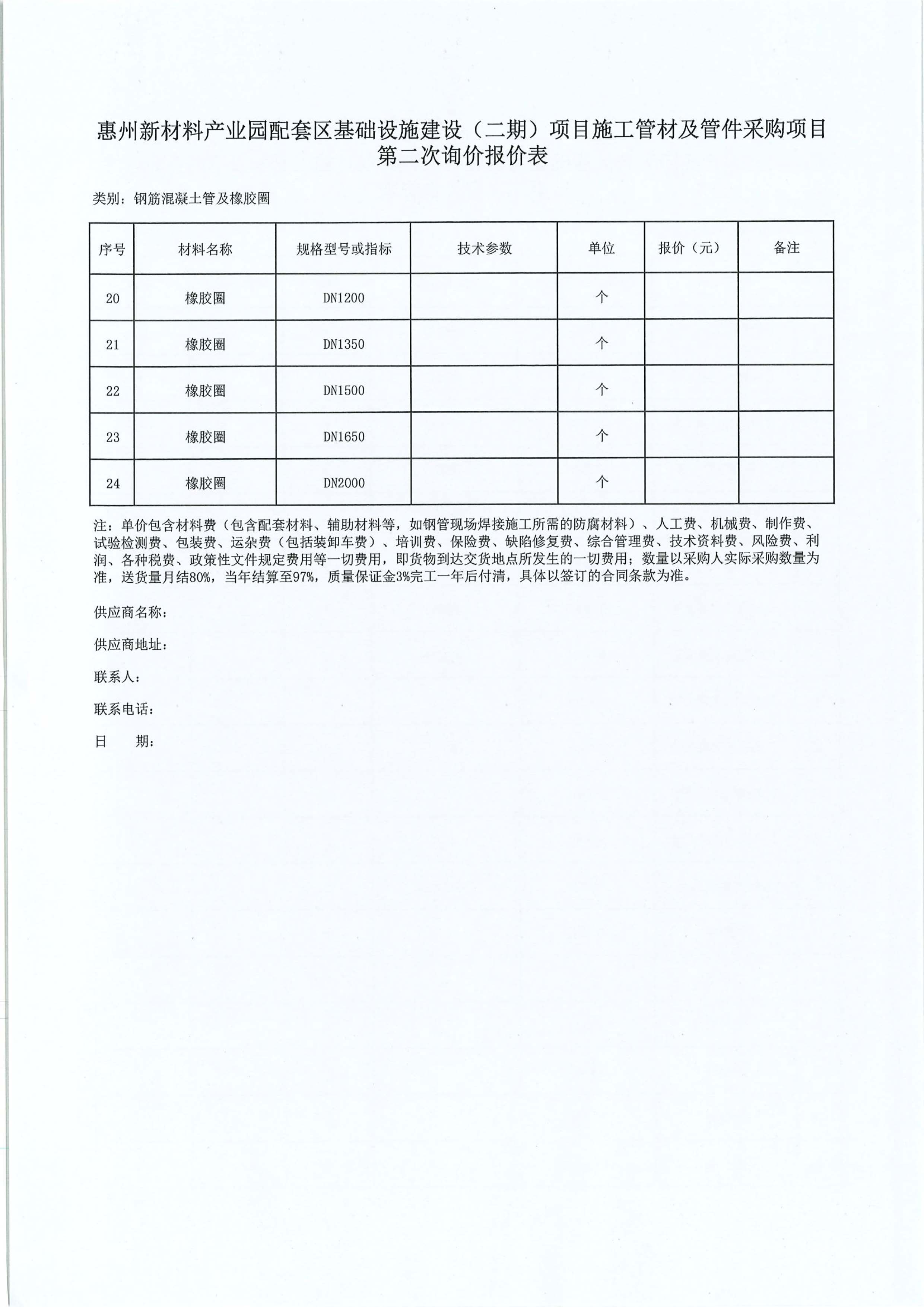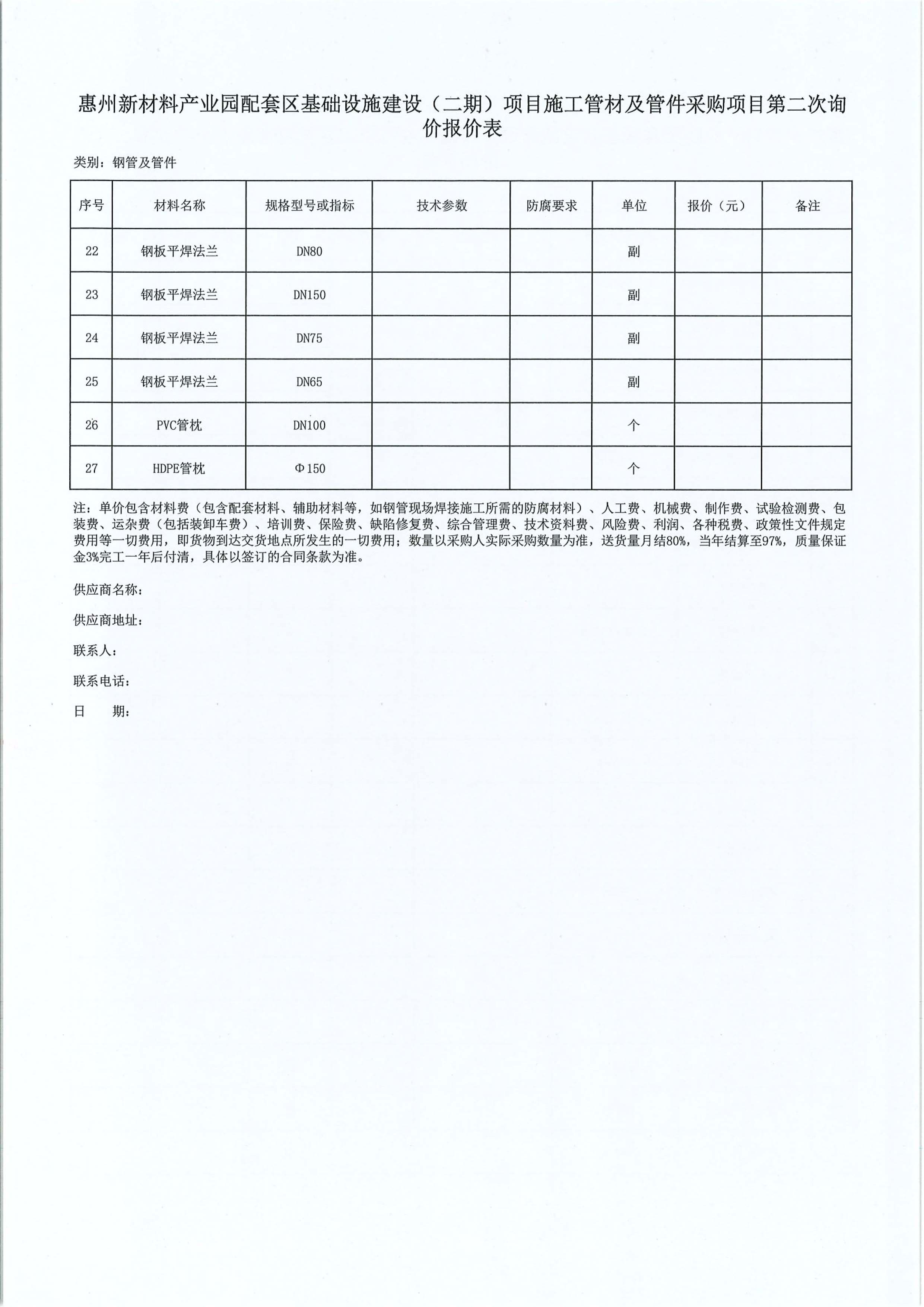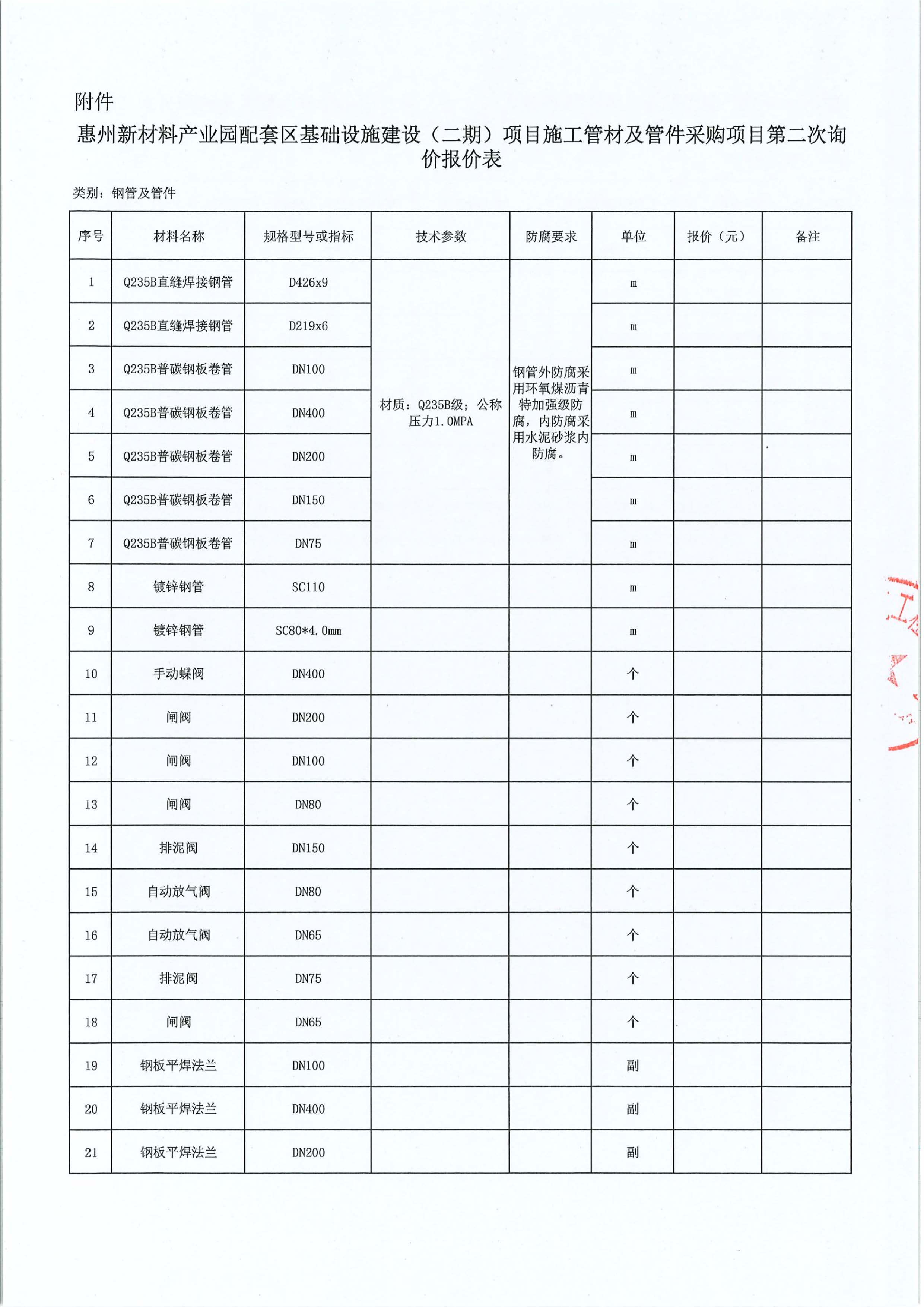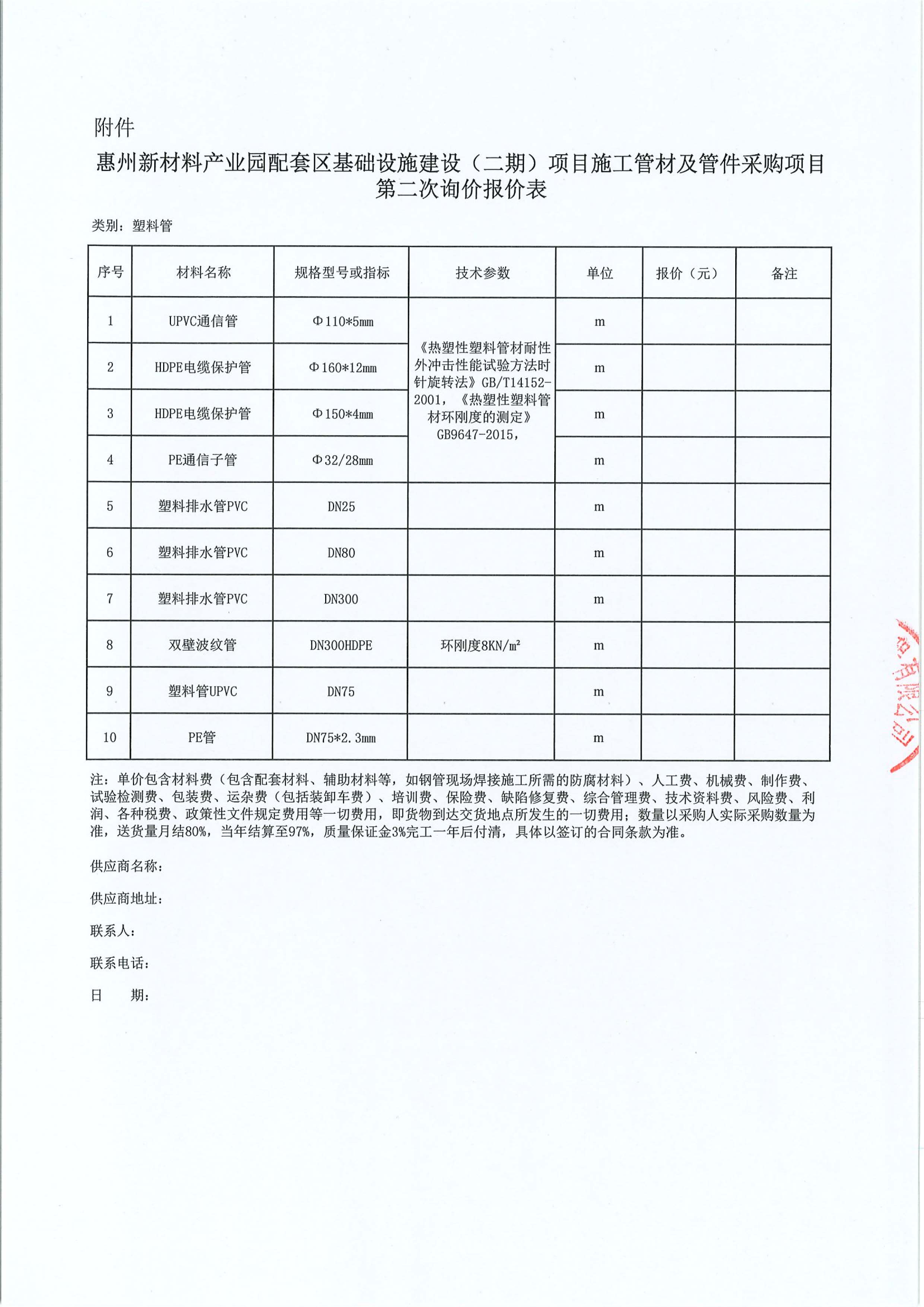 附件:惠州新材料產(chǎn)業(yè)園配套區(qū)基礎(chǔ)設(shè)施建設(shè)(二期)項(xiàng)目施工管材及管件采購項(xiàng)目第二次詢價(jià)報(bào)價(jià)表