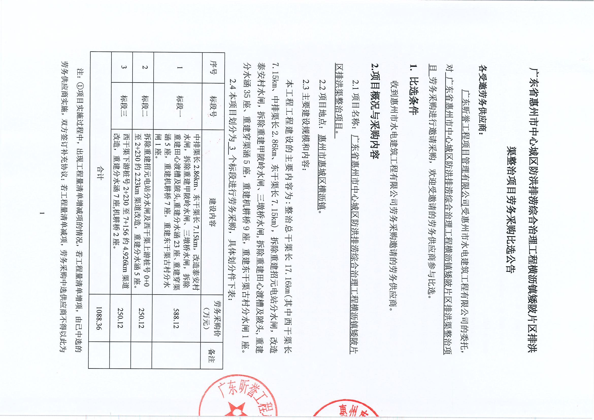 廣東省惠州市中心城區(qū)防洪排澇綜合治理工程橫瀝鎮(zhèn)矮陂片區(qū)排洪渠整治項(xiàng)目勞務(wù)采購(gòu)比選公告