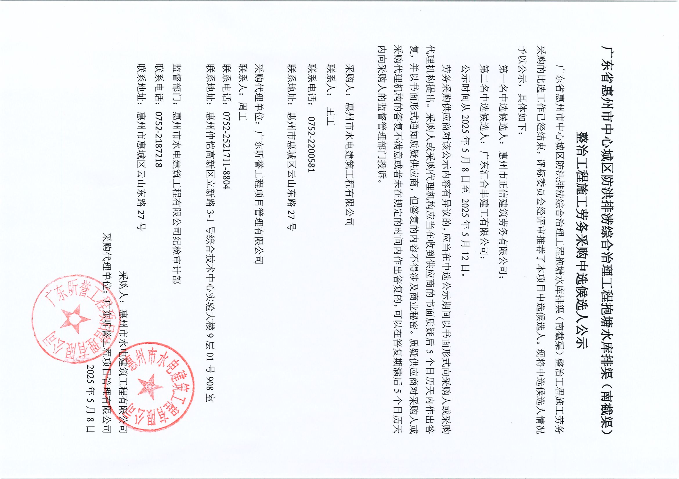 廣東省惠州市中心城區(qū)防洪排澇綜合治理工程釣魚公排澇站擴(kuò)建項(xiàng)目勞務(wù)采購(gòu)中選候選人公示