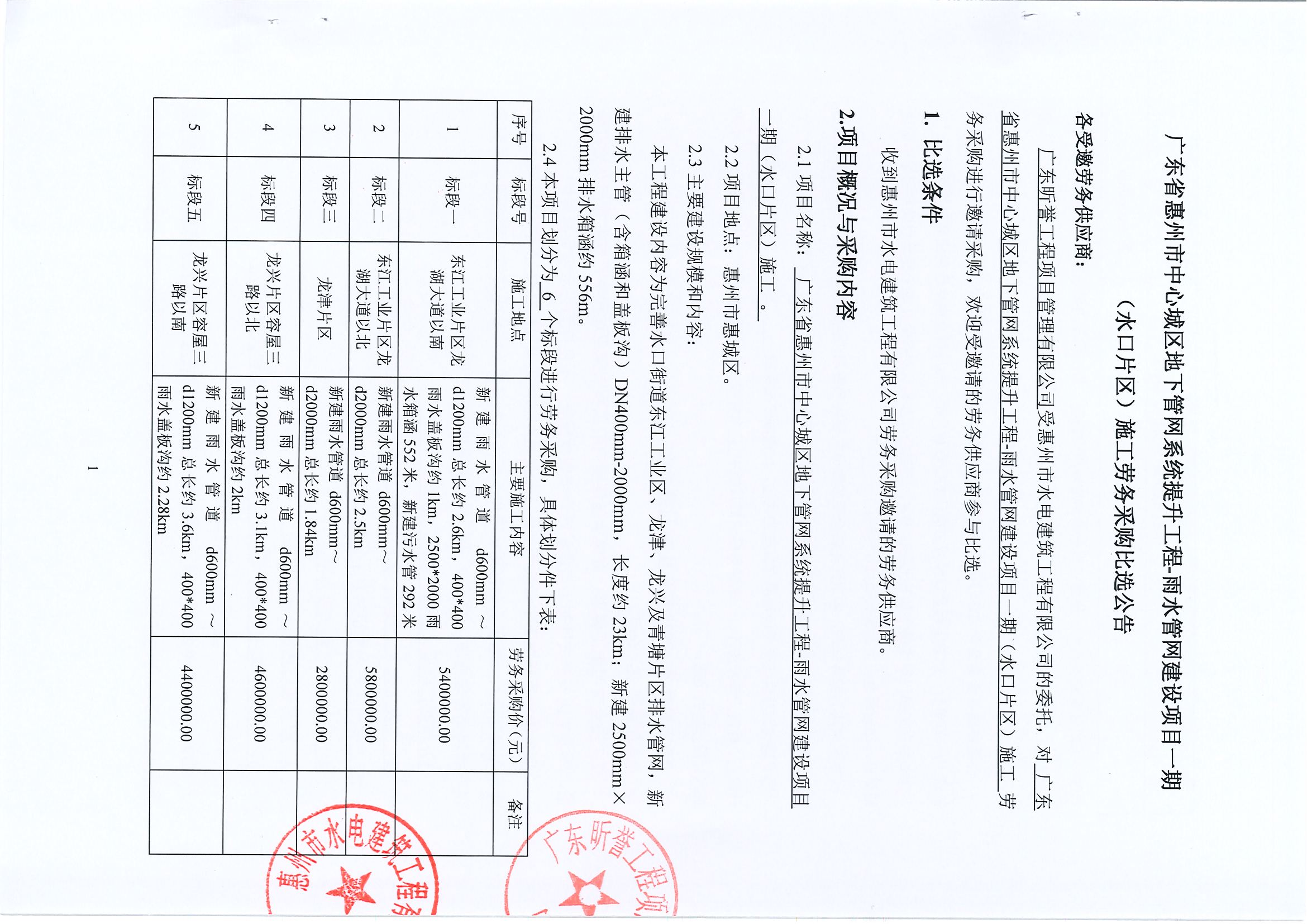 廣東省惠州市中心城區(qū)地下管網(wǎng)系統(tǒng)提升工程-雨水管網(wǎng)建設(shè)項目一期(水口片區(qū))施工勞務采購比選公告