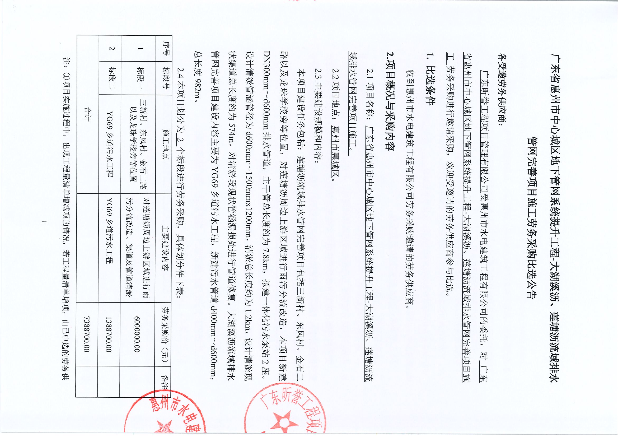 廣東省惠州市中心城區(qū)地下管網(wǎng)系統(tǒng)提升工程-大湖溪瀝、蓮塘瀝流域排水管網(wǎng)完善項(xiàng)目施工勞務(wù)采購(gòu)比選公告