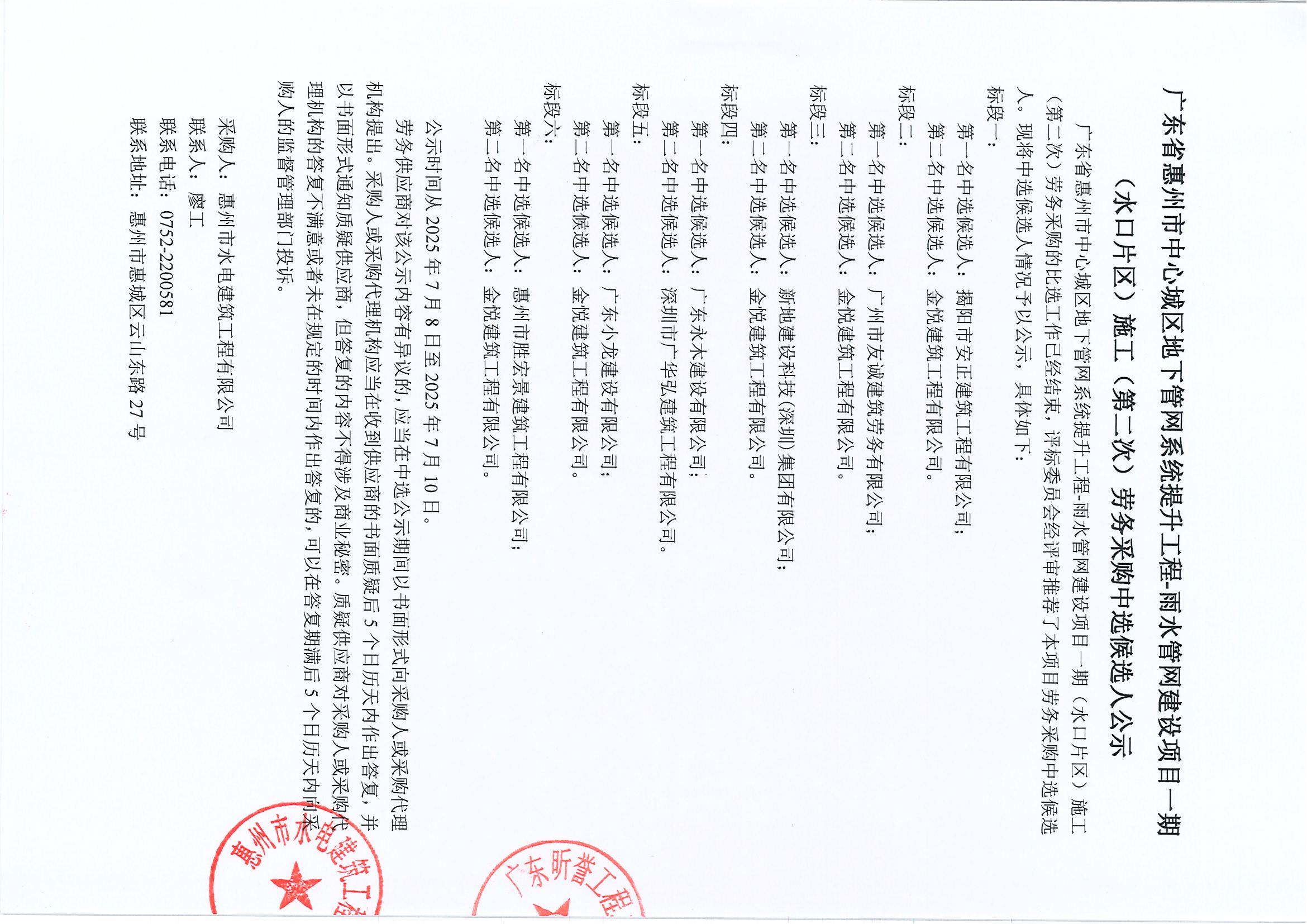 廣東省惠州市中心城區(qū)地下管網(wǎng)系統(tǒng)提升工程-雨水管網(wǎng)建設(shè)項(xiàng)目一期(水口片區(qū))施工(第二次)勞務(wù)采購中選候選人公示