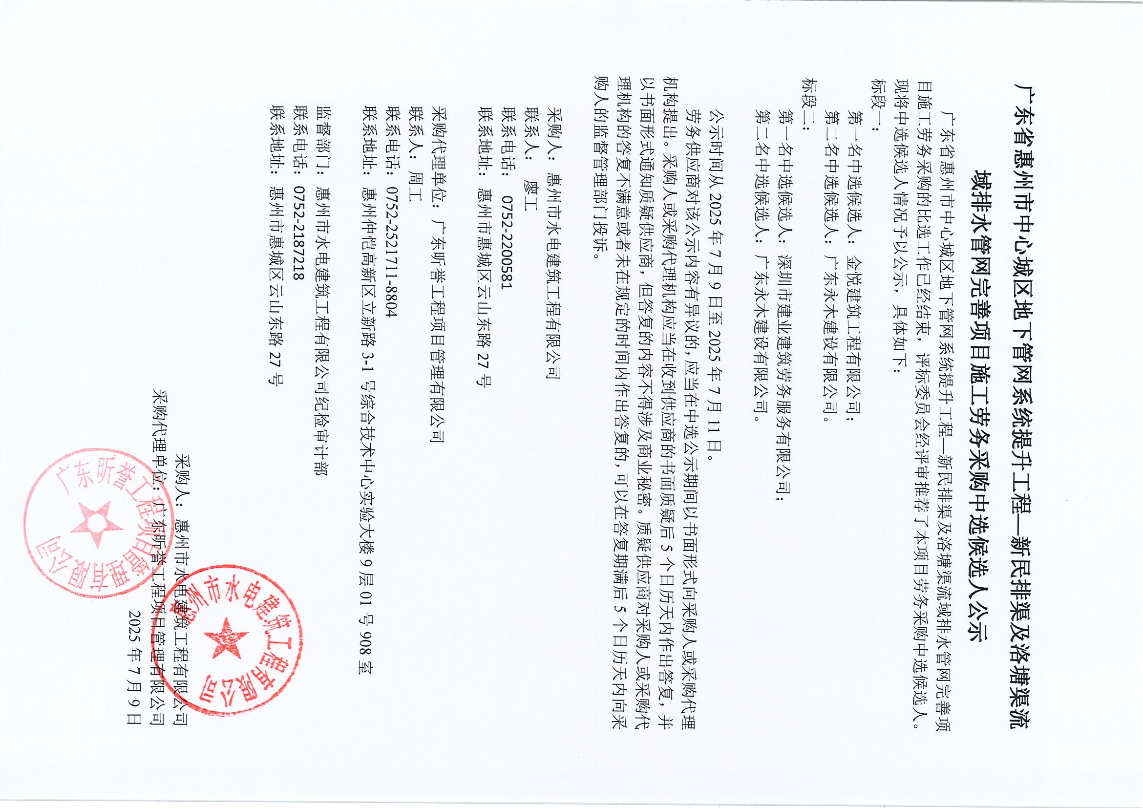廣東省惠州市中心城區(qū)地下管網(wǎng)系統(tǒng)提升工程—新民排渠及洛塘渠流域排水管網(wǎng)完善項(xiàng)目施工勞務(wù)采購中選候選人公示