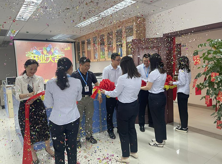 在參加儀式人員的共同見證下,鄭海強(qiáng)、黃敏、張敏、何品良共同為工貿(mào)公司剪彩和揭牌。