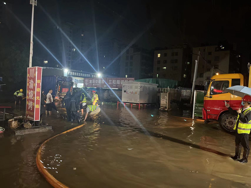 5月13日下午三時(shí)五十分,惠城區(qū)東升路麗景灣上出現(xiàn)嚴(yán)重的內(nèi)澇險(xiǎn)情,我司接到指令后,公司領(lǐng)導(dǎo)立即派出城北片區(qū)應(yīng)急搶險(xiǎn)(第一小隊(duì))12人,3臺(tái)應(yīng)急工作車,攜帶排澇設(shè)備4臺(tái)抽水泵,1臺(tái)大功率(2.5KW)應(yīng)急發(fā)電機(jī)赴現(xiàn)場開展應(yīng)急排澇增援工作。經(jīng)不斷抽排,內(nèi)澇險(xiǎn)情得到有效緩解。