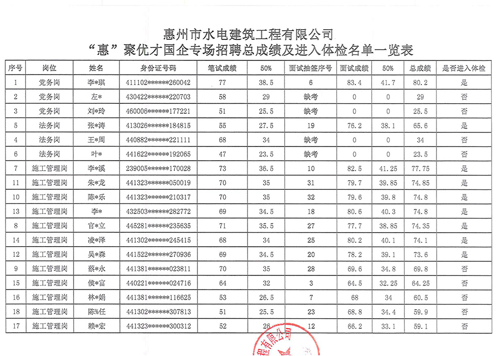 惠州市水電建筑工程有限公司“惠”聚優(yōu)才國企專場招聘總成績及進(jìn)入體檢名單通告