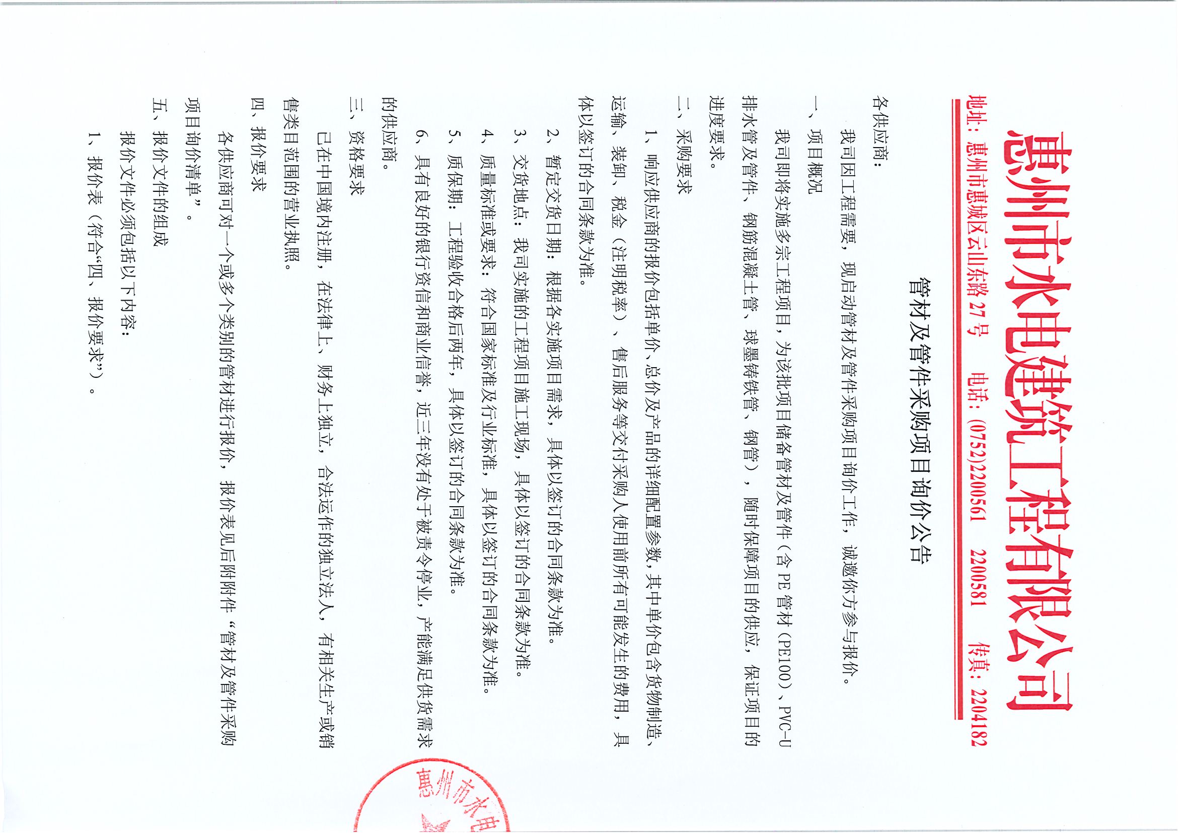 管材及管件采購項(xiàng)目詢價公告