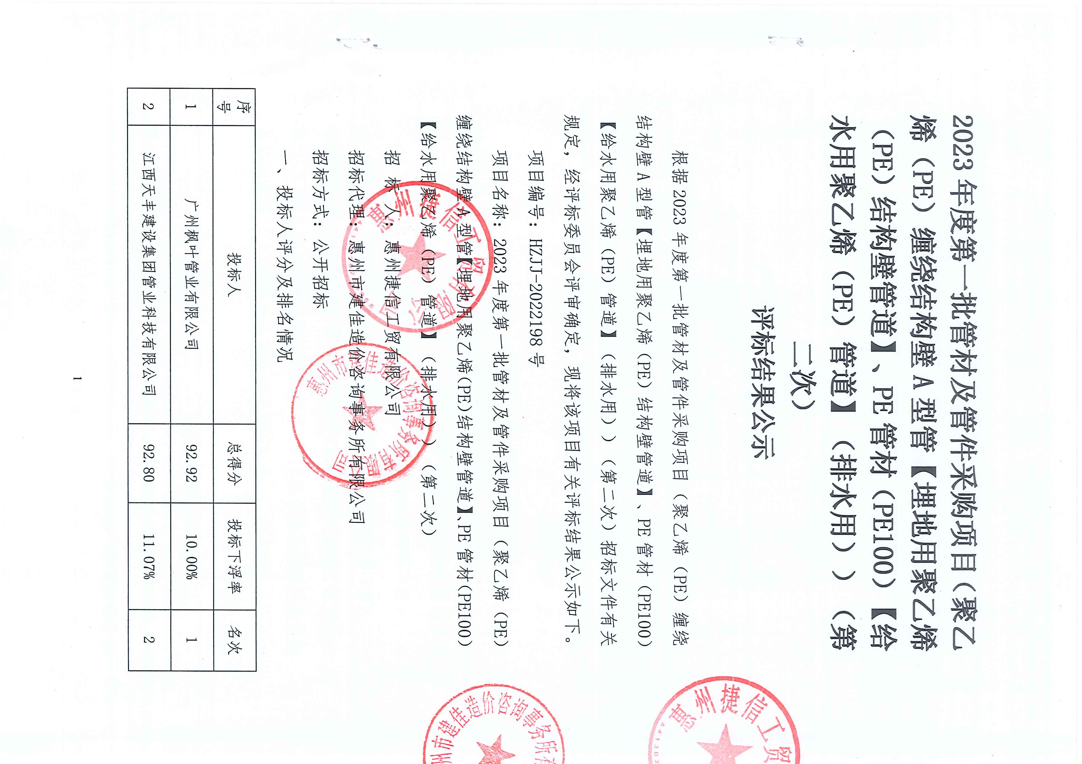 捷信工貿(mào)公司2023年度第一批管材及管件采購項目(標段一)(第二次)評標結(jié)果公示