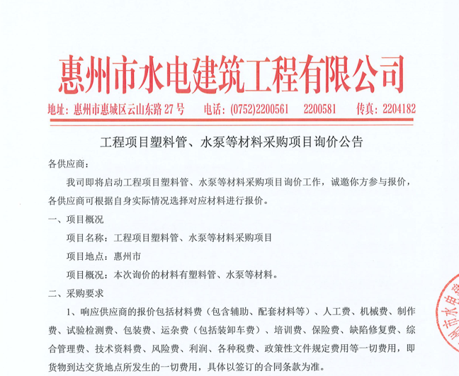 工程項(xiàng)目塑料管、水泵等材料采購(gòu)項(xiàng)目詢價(jià)公告......