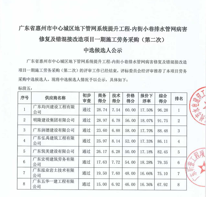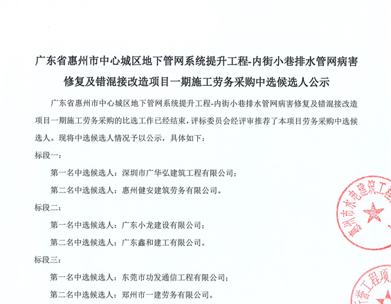 廣東省惠州市中心城區(qū)地下管網(wǎng)系統(tǒng)提升工程-內(nèi)街小巷排水管網(wǎng)病害修復(fù)及錯(cuò)混接改造項(xiàng)目一期施工勞務(wù)采購(gòu)中選候選人公示......