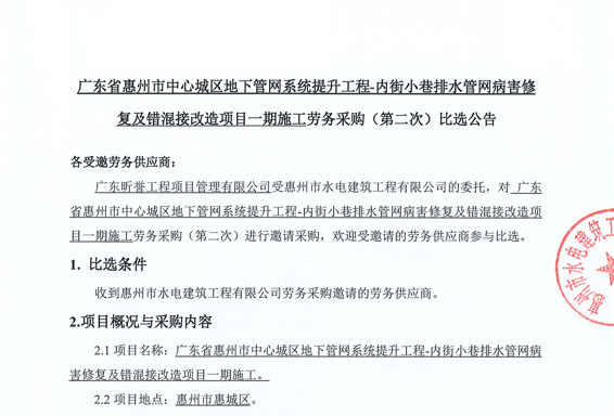 廣東省惠州市中心城區(qū)地下管網(wǎng)系統(tǒng)提升工程-內(nèi)街小巷排水管網(wǎng)病害修復(fù)及錯(cuò)混接改造項(xiàng)目一期施工勞務(wù)采購(gòu)(第二次)比選公告......