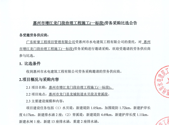 惠州市增江龍門(mén)段治理工程施工(一標(biāo)段)勞務(wù)采購(gòu)比選公告......