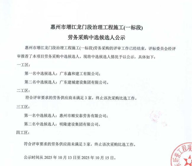 惠州市增江龍門(mén)段治理工程施工(一標(biāo)段)勞務(wù)采購(gòu)中選候選人公示......