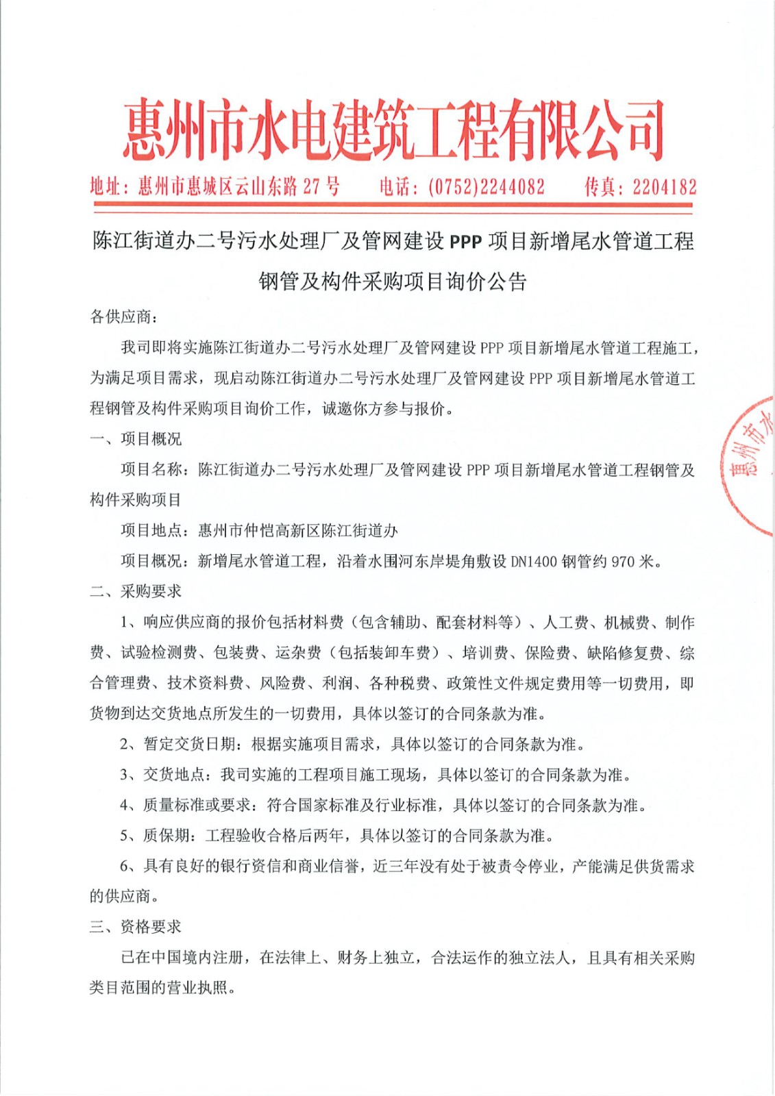 陳江街道辦二號(hào)污水處理廠及管網(wǎng)建設(shè)PPP項(xiàng)目新增尾水管道工程鋼管及構(gòu)件采購(gòu)項(xiàng)目第二次詢價(jià)公告附件:/upload/202412/09/202412091458001110.xls......