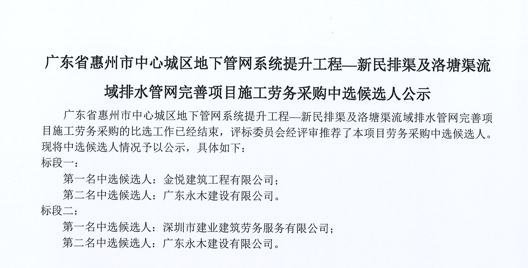 廣東省惠州市中心城區(qū)地下管網(wǎng)系統(tǒng)提升工程—新民排渠及洛塘渠流域排水管網(wǎng)完善項目施工勞務(wù)采購中選候選人公示......