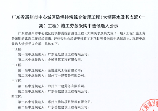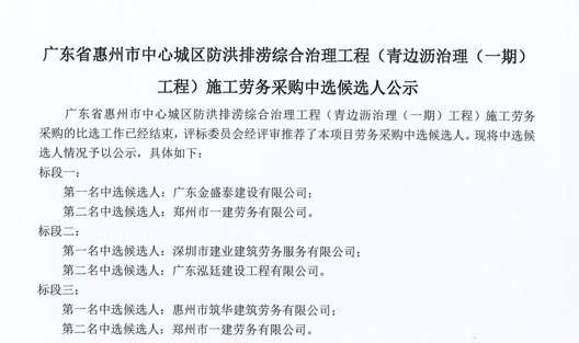 廣東省惠州市中心城區(qū)防洪排澇綜合治理工程(青邊瀝治理(一期)工程)施工勞務(wù)采購中選候選人公示......