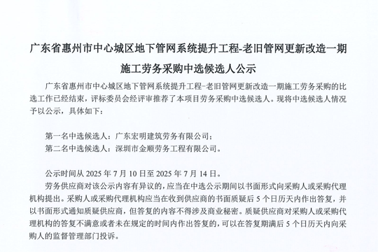 廣東省惠州市中心城區(qū)地下管網(wǎng)系統(tǒng)提升工程-老舊管網(wǎng)更新改造一期施工勞務(wù)采購中選候選人公示......