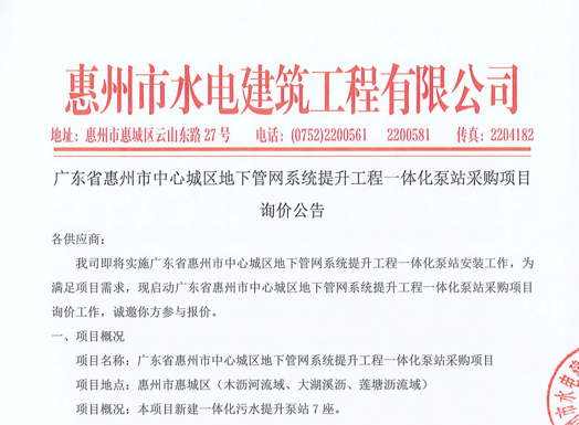 廣東省惠州市中心城區(qū)地下管網(wǎng)系統(tǒng)提升工程一體化泵站采購項目詢價公告......