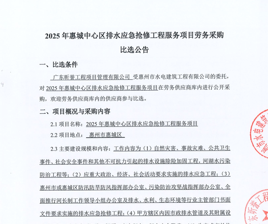 2025年惠城中心區(qū)排水應(yīng)急搶修工程服務(wù)項目勞務(wù)采購比選公告......
