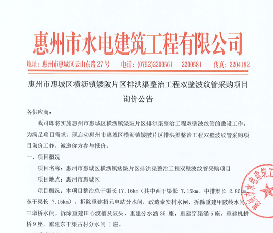 惠州市惠城區(qū)橫瀝鎮(zhèn)矮陂片區(qū)排洪渠整治工程雙壁波紋管采購項目詢價公告......