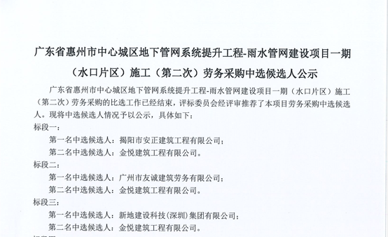 廣東省惠州市中心城區(qū)地下管網(wǎng)系統(tǒng)提升工程-雨水管網(wǎng)建設(shè)項(xiàng)目一期(水口片區(qū))施工(第二次)勞務(wù)采購(gòu)中選候選人公示......