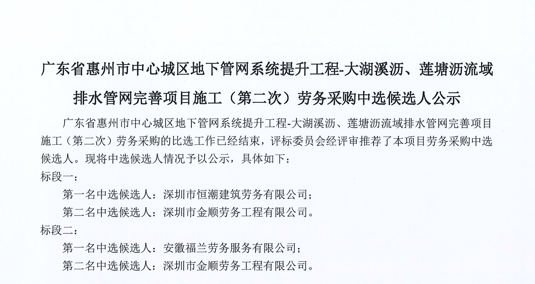 廣東省惠州市中心城區(qū)地下管網(wǎng)系統(tǒng)提升工程-大湖溪瀝、蓮塘瀝流域排水管網(wǎng)完善項(xiàng)目施工(第二次)勞務(wù)采購(gòu)中選候選人公示......