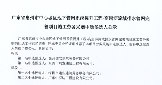 廣東省惠州市中心城區(qū)地下管網(wǎng)系統(tǒng)提升工程-高窟瀝流域排水管網(wǎng)完善項(xiàng)目施工勞務(wù)采購(gòu)中選候選人公示......