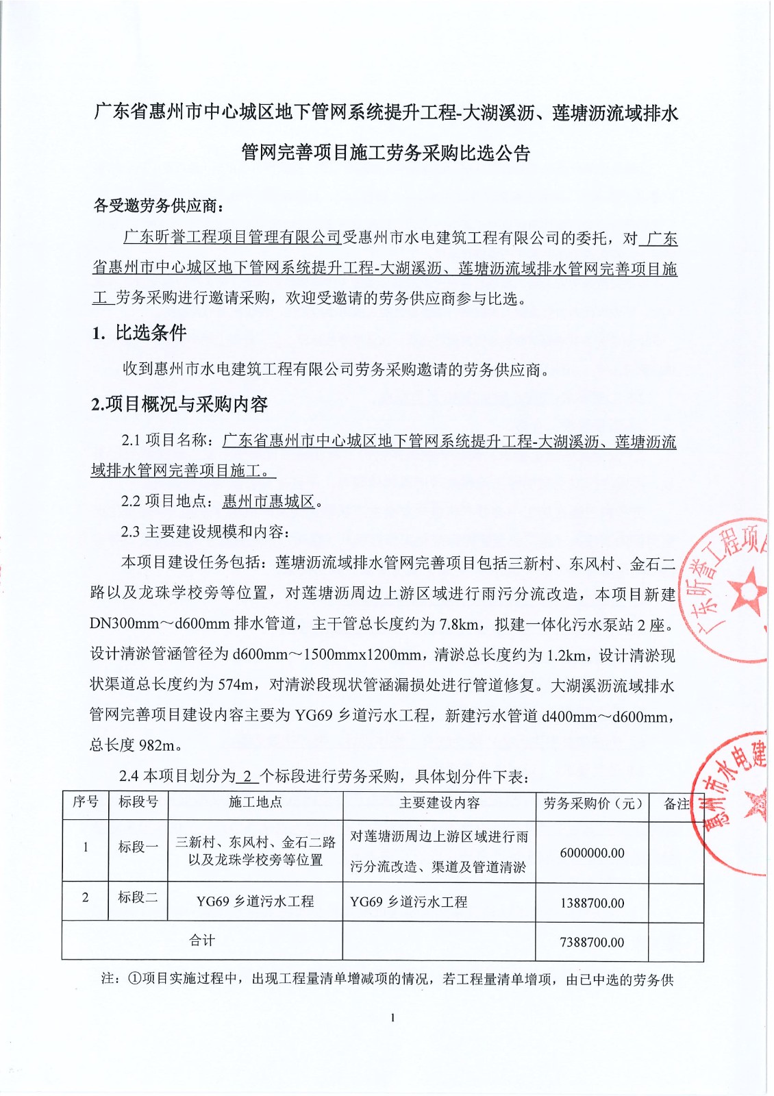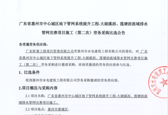 廣東省惠州市中心城區(qū)地下管網(wǎng)系統(tǒng)提升工程-大湖溪瀝、蓮塘瀝流域排水管網(wǎng)完善項目施工勞務(wù)采購比選公告......