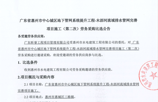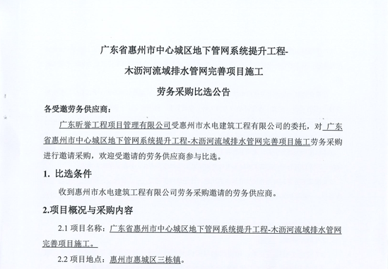 廣東省惠州市中心城區(qū)地下管網(wǎng)系統(tǒng)提升工程-木瀝河流域排水管網(wǎng)完善項目施工(第二次)勞務(wù)采購比選公告......