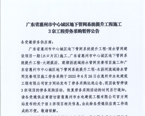 廣東省惠州市中心城區(qū)地下管網(wǎng)系統(tǒng)提升工程施工3宗工程勞務(wù)采購暫停公告......