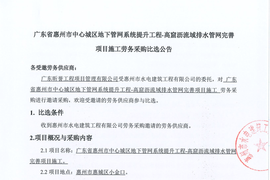 廣東省惠州市中心城區(qū)地下管網(wǎng)系統(tǒng)提升工程-高窟瀝流域排水管網(wǎng)完善項目施工勞務(wù)采購比選公告......