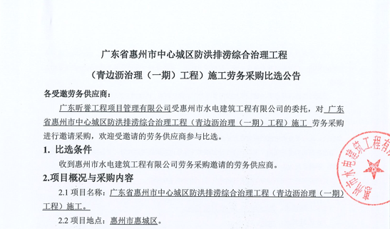 廣東省惠州市中心城區(qū)防洪排澇綜合治理工程(青邊瀝治理(一期)工程)施工勞務(wù)采購比選公告......