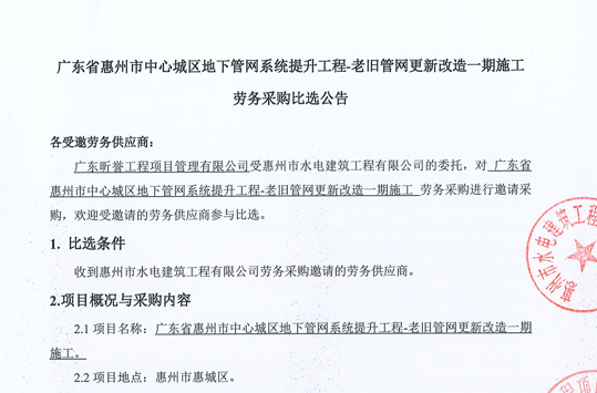 廣東省惠州市中心城區(qū)地下管網(wǎng)系統(tǒng)提升工程-老舊管網(wǎng)更新改造一期施工勞務(wù)采購比選公告......