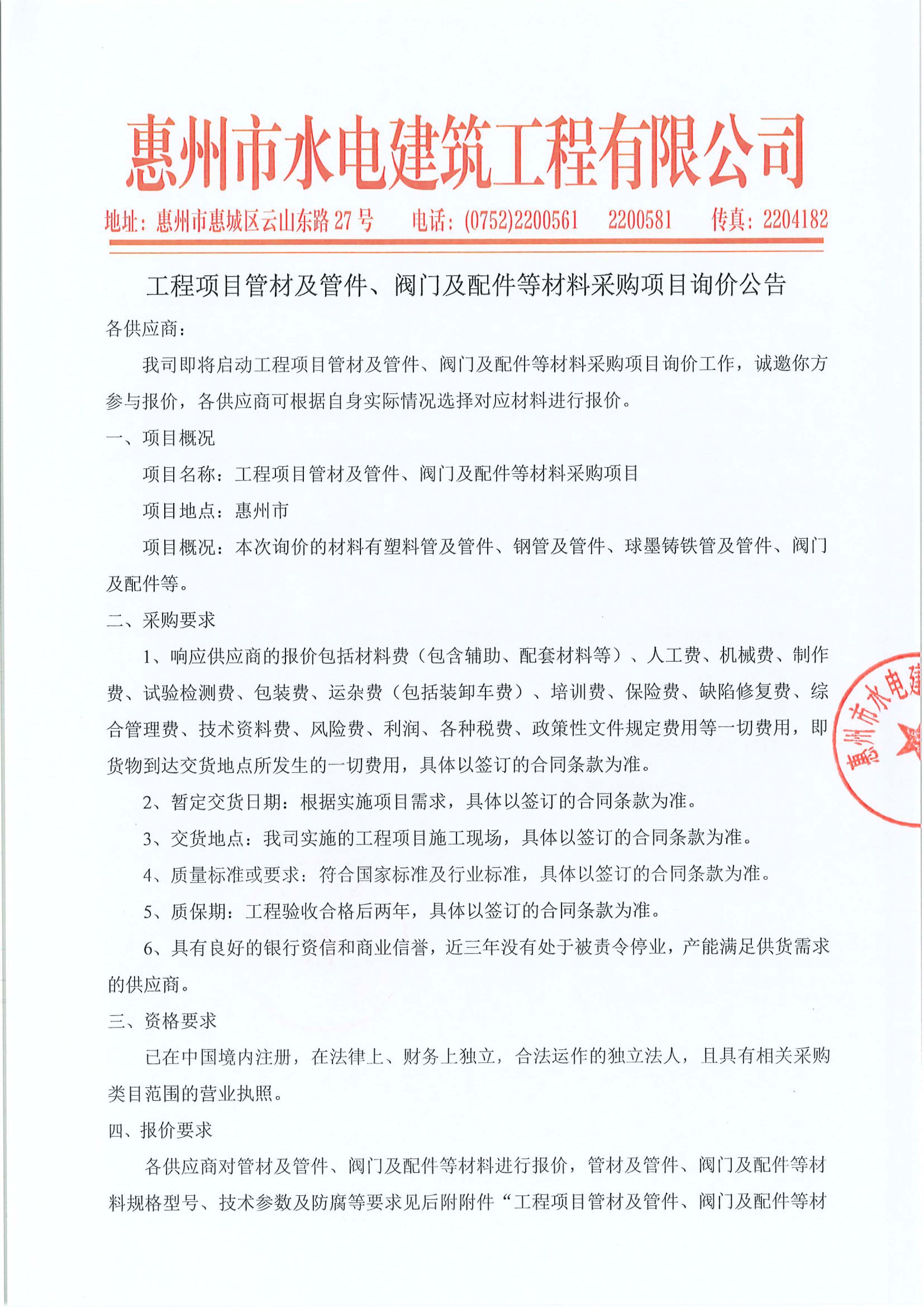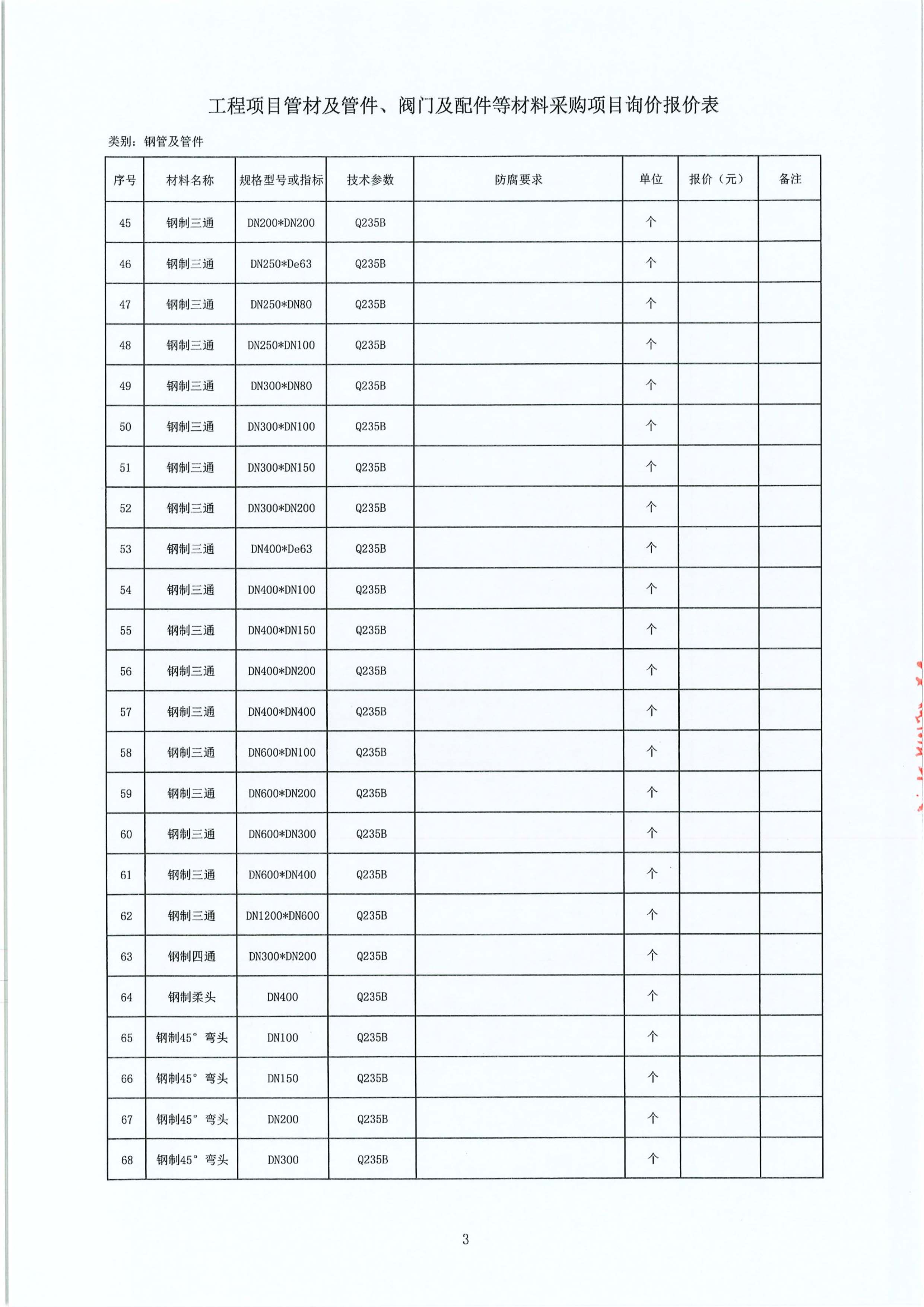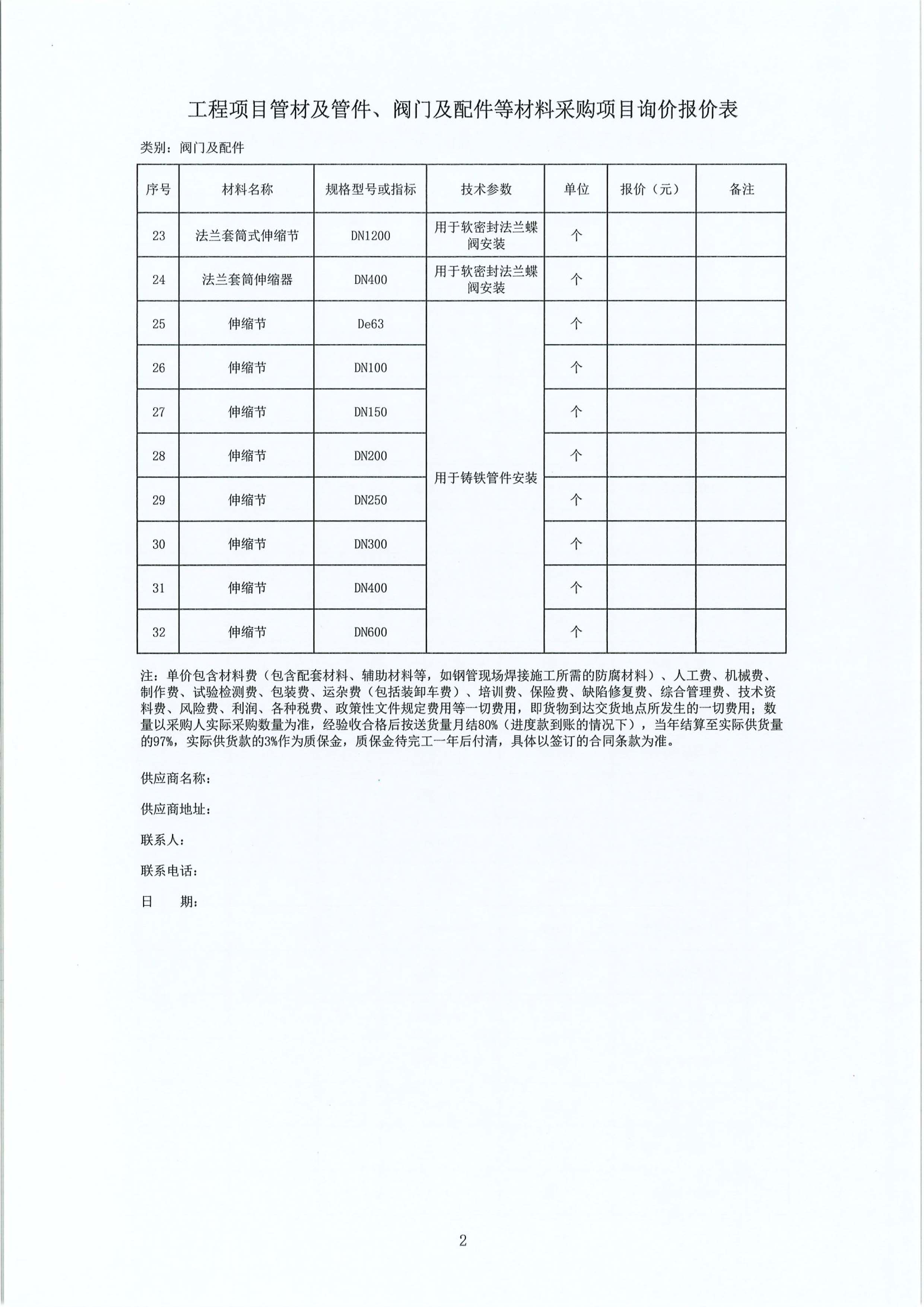工程項(xiàng)目管材及管件、閥門及配件等材料采購項(xiàng)目詢價(jià)公告