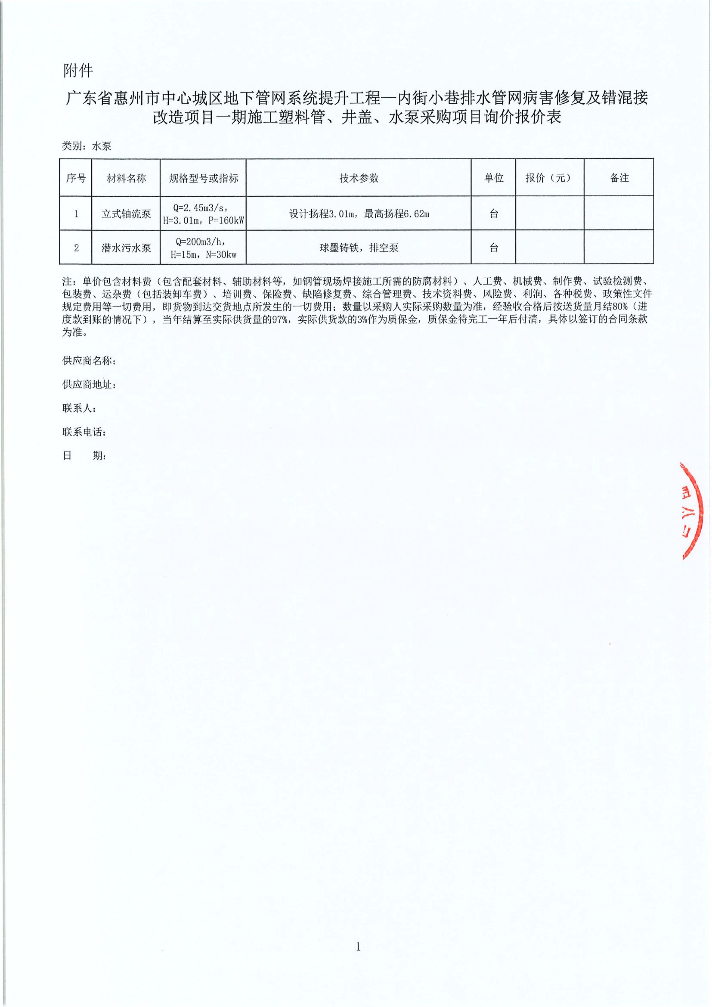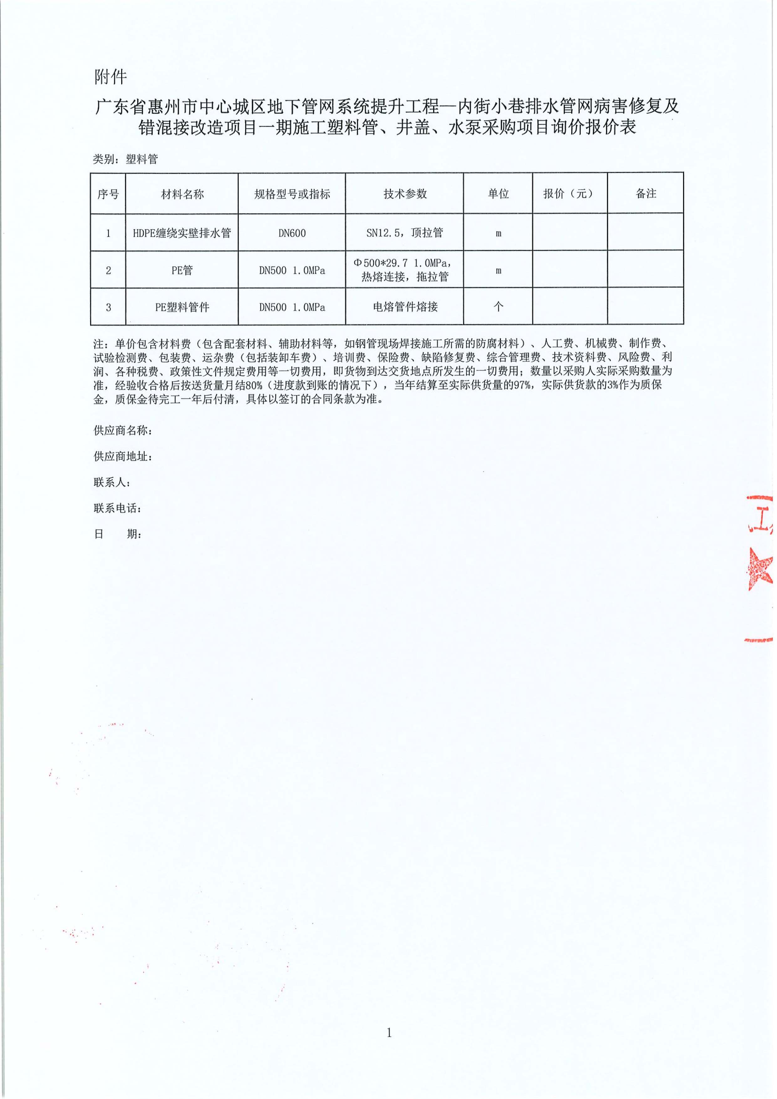 廣東省惠州市中心城區(qū)地下管網(wǎng)系統(tǒng)提升工程—內(nèi)街小巷排水管網(wǎng)病害修復(fù)及錯混接改造項目一期施工塑料管、井蓋、水泵采購項目詢價公告附件: